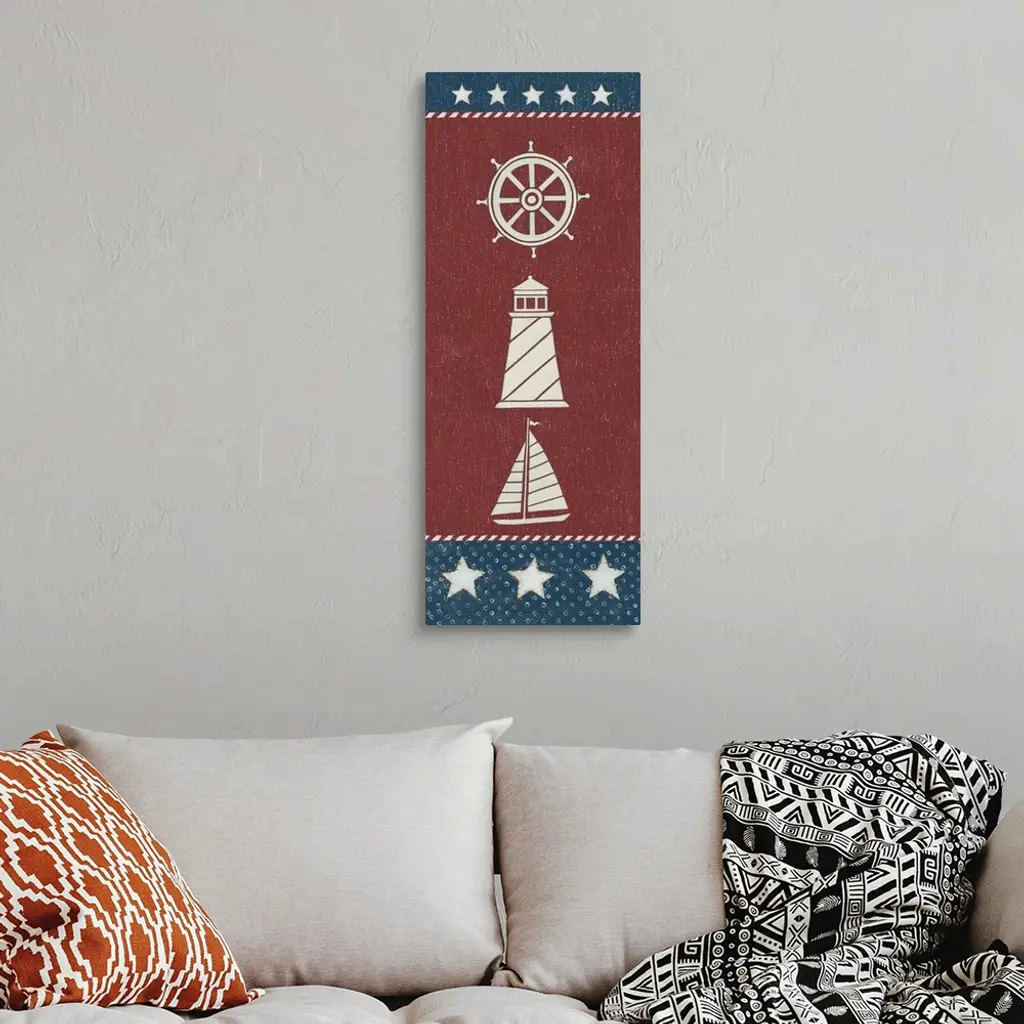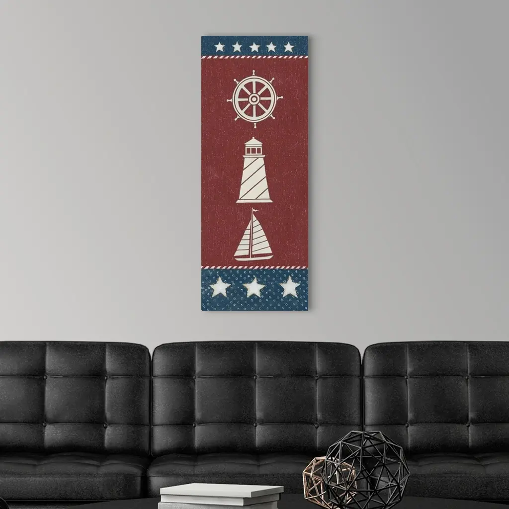 Tall vertical red, white, and blue American nautical themed painting.