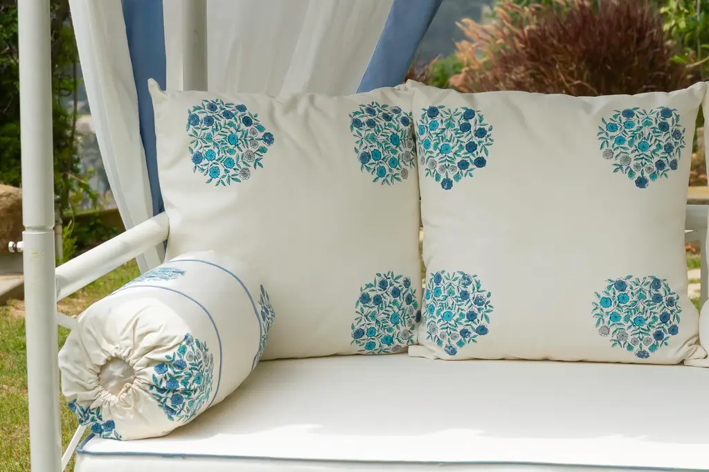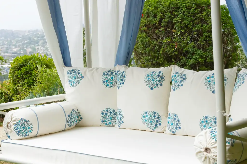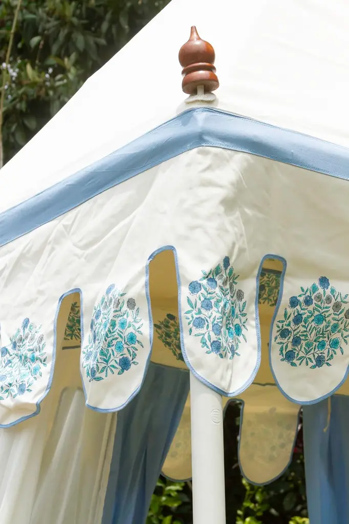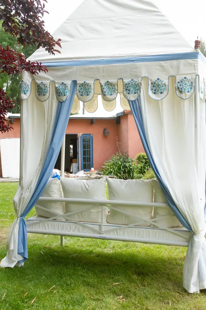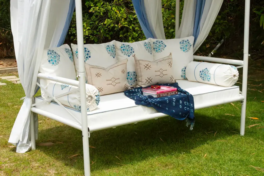 Featuring a traditional bouquet of Indian flowers block print fabric overhang and a painted metal frame, this canopy daybed has a very tall cone-shaped ceiling, giving it a royal bohemian look. This De-cor exclusive design was constructed by skilled artisans in Northwest India using a strong iron frame and waterproof canvas, making it suitable as a garden daybed or patio seating. The canvas features a traditional block print design, which is a method of printing patterns onto fabric using carved wooden blocks. The design of this block print is inspired by traditional royal India, with a bouquet of flowers displayed in a variety of blue tones on a white canvas background. The canopy is built with a painted white iron frame and a custom foam mattress. This royal lounge daybed is a beautiful and functional piece of furniture that is sure to add style and elegance to any space. It includes four square pillows and two bolsters, with pillows featuring the same block print design as the fabric. They are designed to provide additional comfort and support when lounging on the daybed. This daybed disassembles for transportation and will need to be assembled at its final destination by the customer. The block print work may have slight variations due to its handmade process. The fabric may show minor discoloration or stains. The metal frame may display minor chips and peels. *Extra pillows and throws not included but are available to purchase. **Please bear in mind that colors of products shown may vary slightly from their original color due to monitor display settings or photography studio lighting.