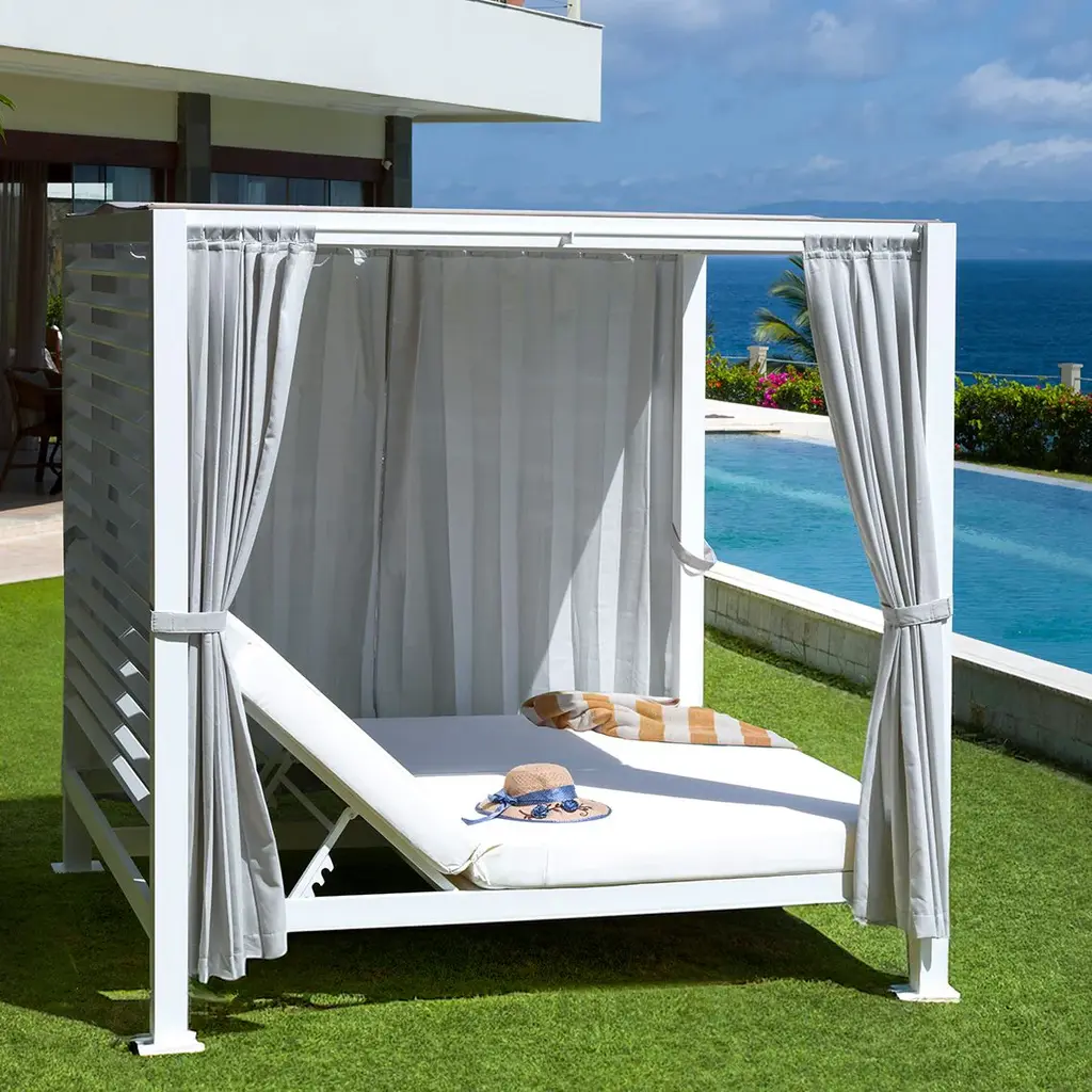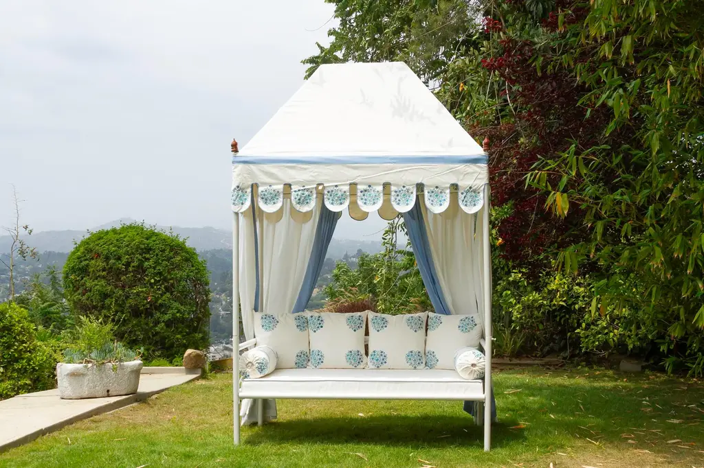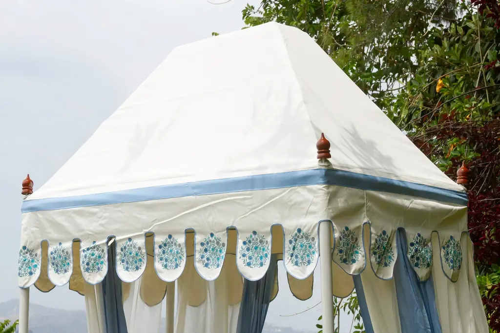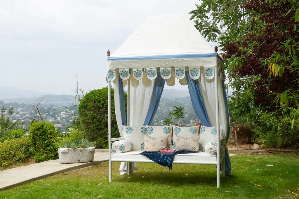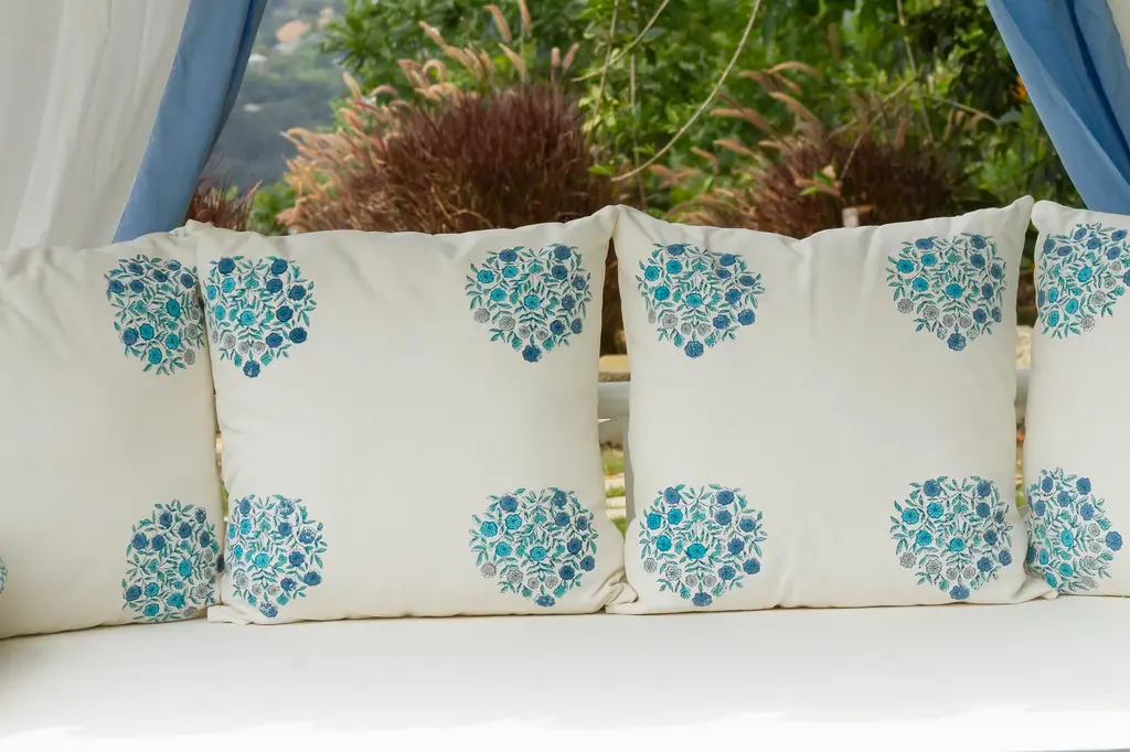 Featuring a traditional bouquet of Indian flowers block print fabric overhang and a painted metal frame, this canopy daybed has a very tall cone-shaped ceiling, giving it a royal bohemian look. This De-cor exclusive design was constructed by skilled artisans in Northwest India using a strong iron frame and waterproof canvas, making it suitable as a garden daybed or patio seating. The canvas features a traditional block print design, which is a method of printing patterns onto fabric using carved wooden blocks. The design of this block print is inspired by traditional royal India, with a bouquet of flowers displayed in a variety of blue tones on a white canvas background. The canopy is built with a painted white iron frame and a custom foam mattress. This royal lounge daybed is a beautiful and functional piece of furniture that is sure to add style and elegance to any space. It includes four square pillows and two bolsters, with pillows featuring the same block print design as the fabric. They are designed to provide additional comfort and support when lounging on the daybed. This daybed disassembles for transportation and will need to be assembled at its final destination by the customer. The block print work may have slight variations due to its handmade process. The fabric may show minor discoloration or stains. The metal frame may display minor chips and peels. *Extra pillows and throws not included but are available to purchase. **Please bear in mind that colors of products shown may vary slightly from their original color due to monitor display settings or photography studio lighting.