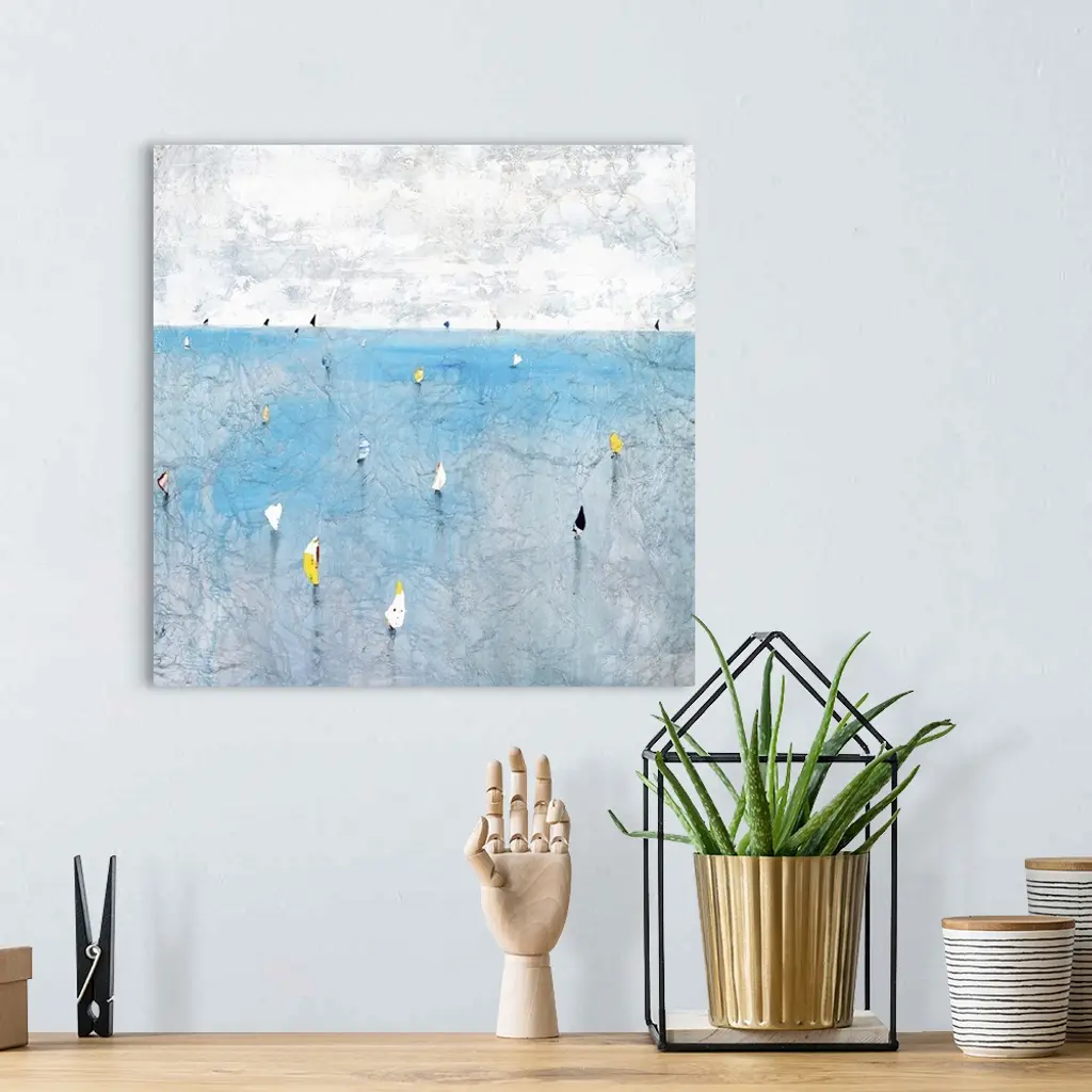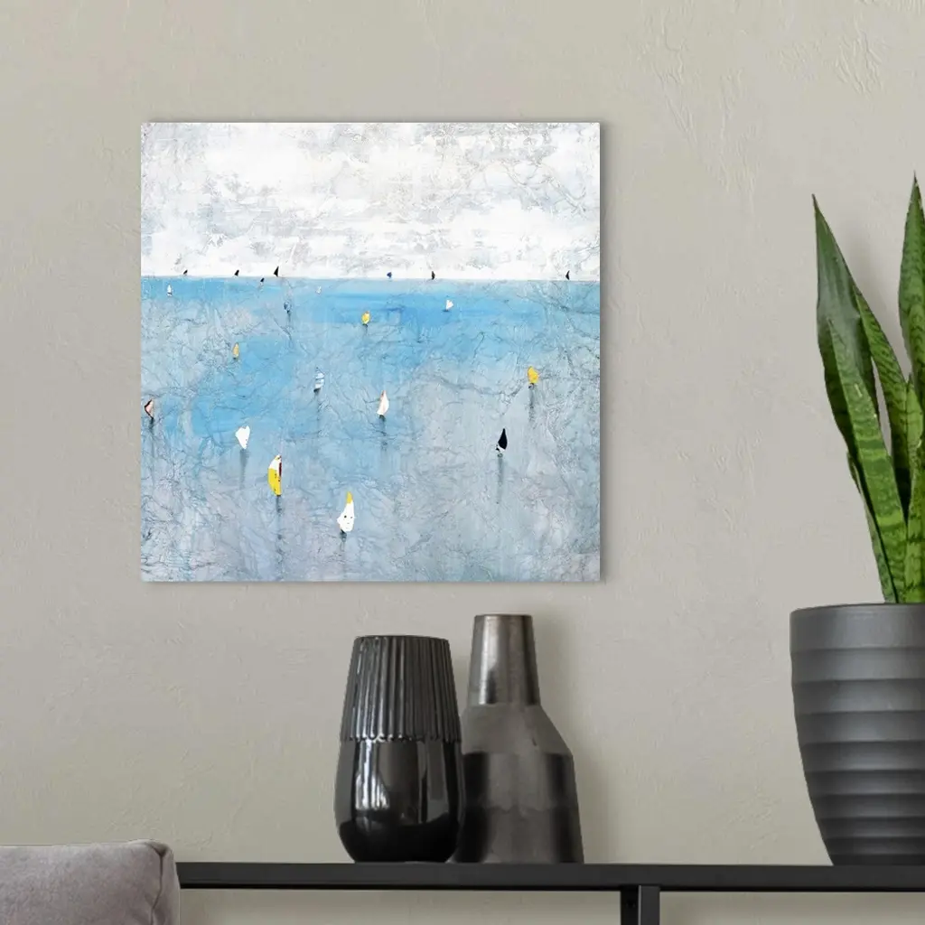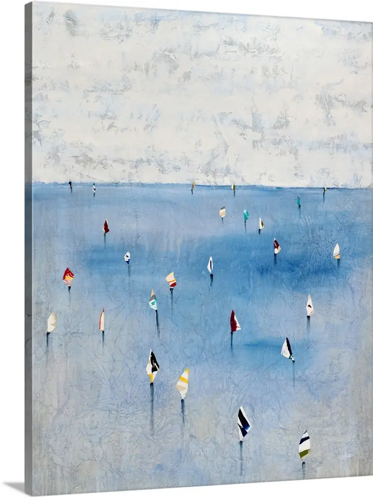 Contemporary abstract painting using pale colors to make a sea filled sailboats.