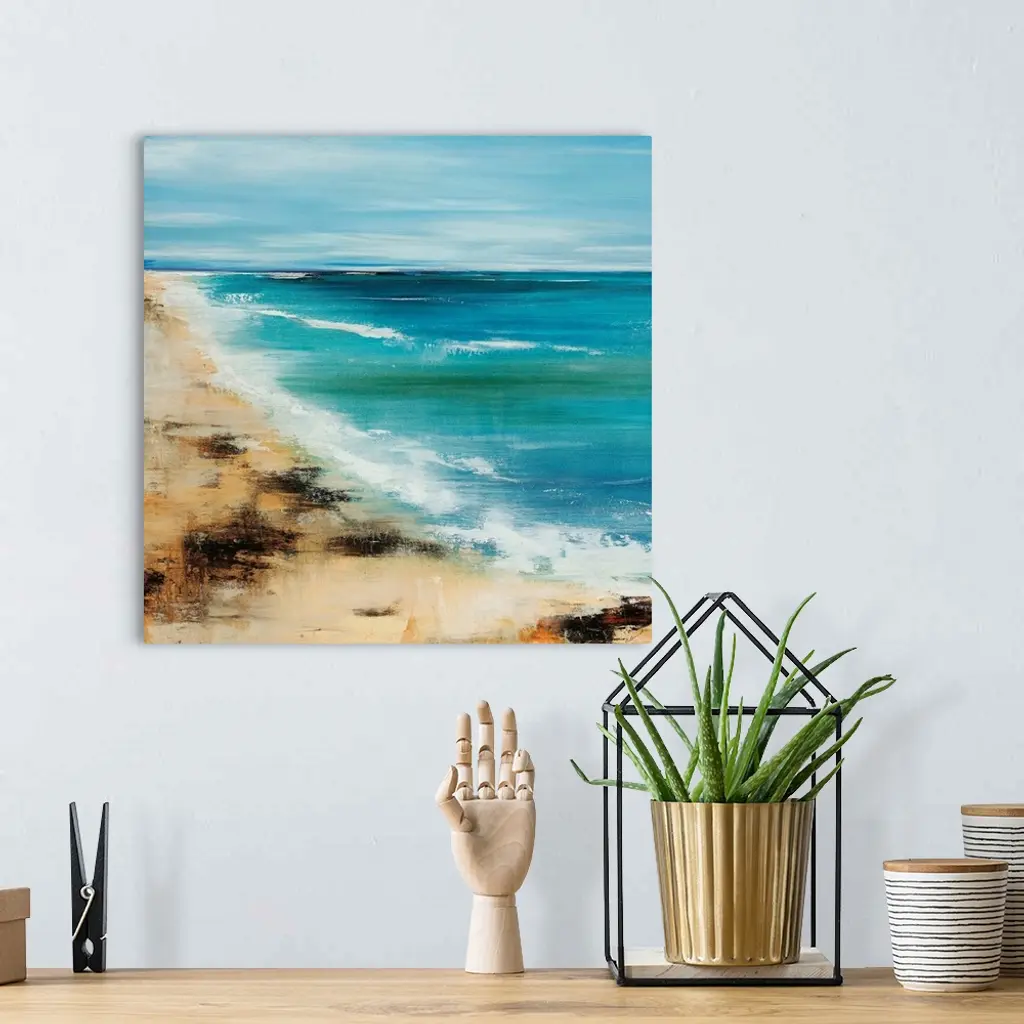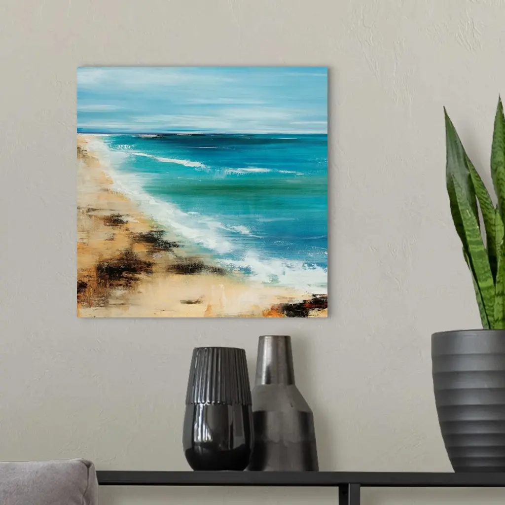 Contemporary painting of slightly blurred, out of focus shoreline with surf and waves rolling in under a cloud sky.