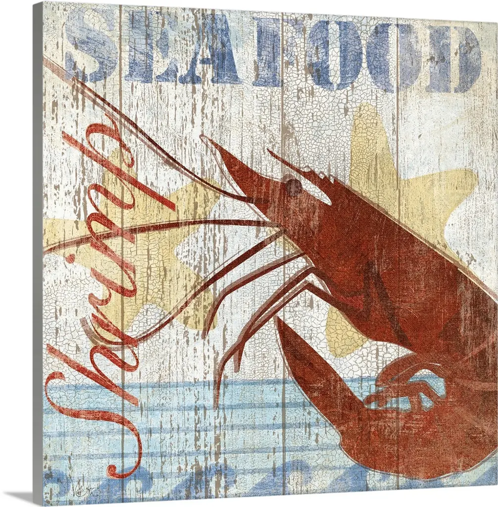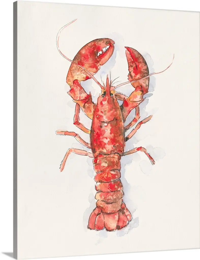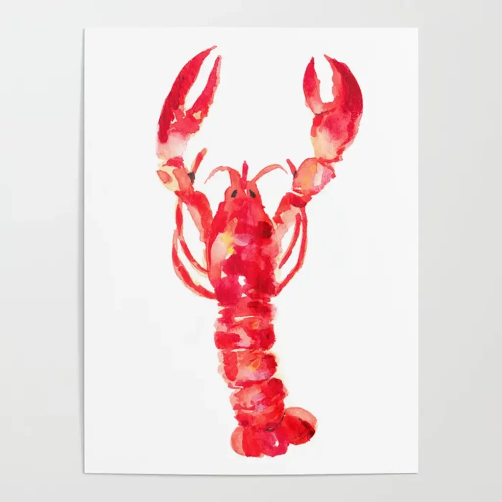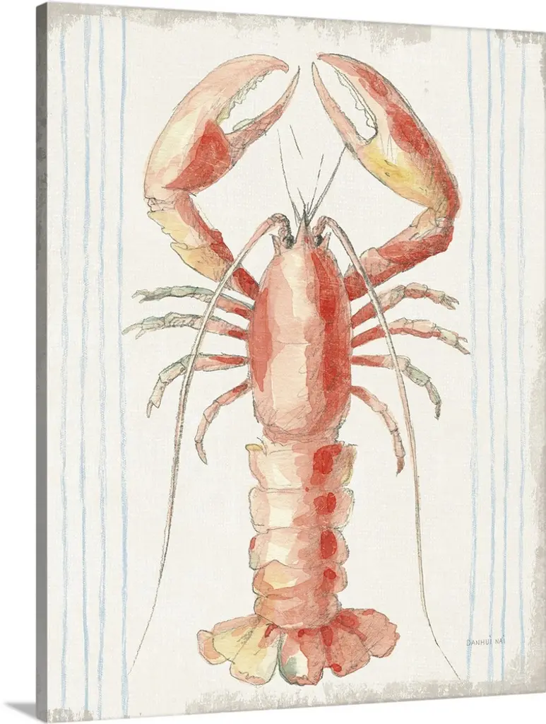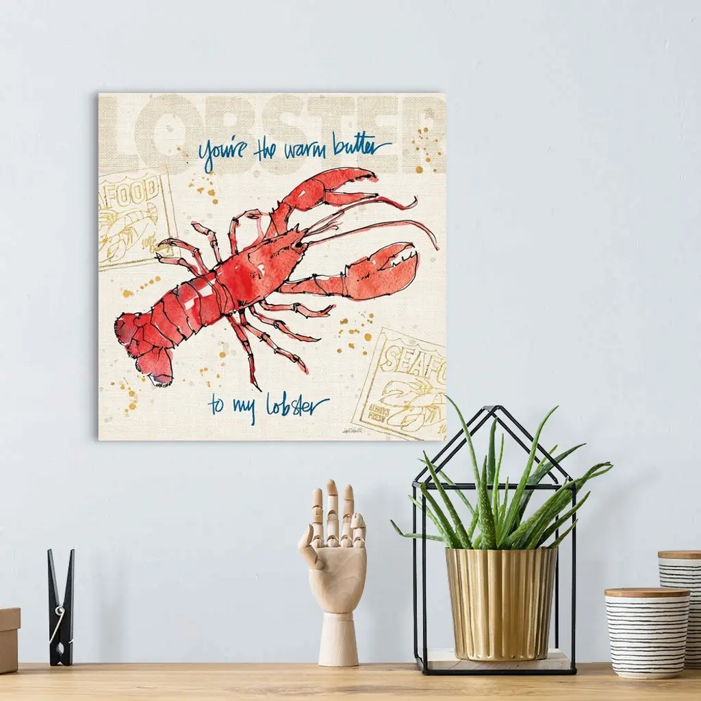 "You're the Warm Butter to My Lobster" written in blue with a watercolor painting of a lobster on a burlap textured background with gold paint splatter.