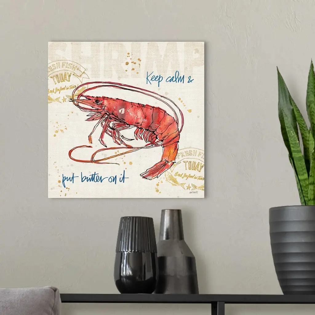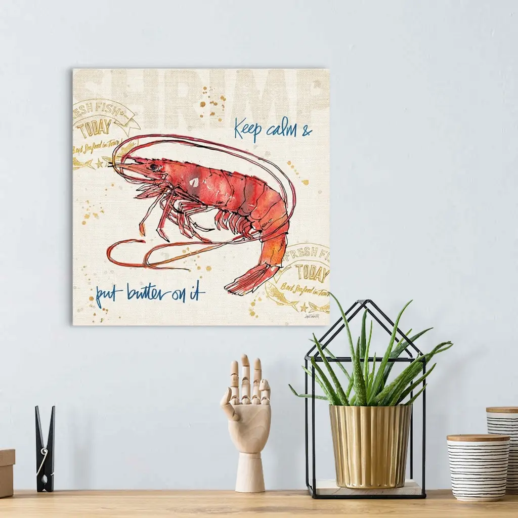 "Keep Calm and Put Butter on it" written in blue with a watercolor painting of a shrimp on a burlap textured background with gold paint splatter.