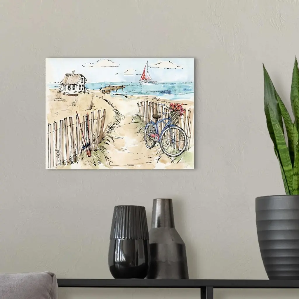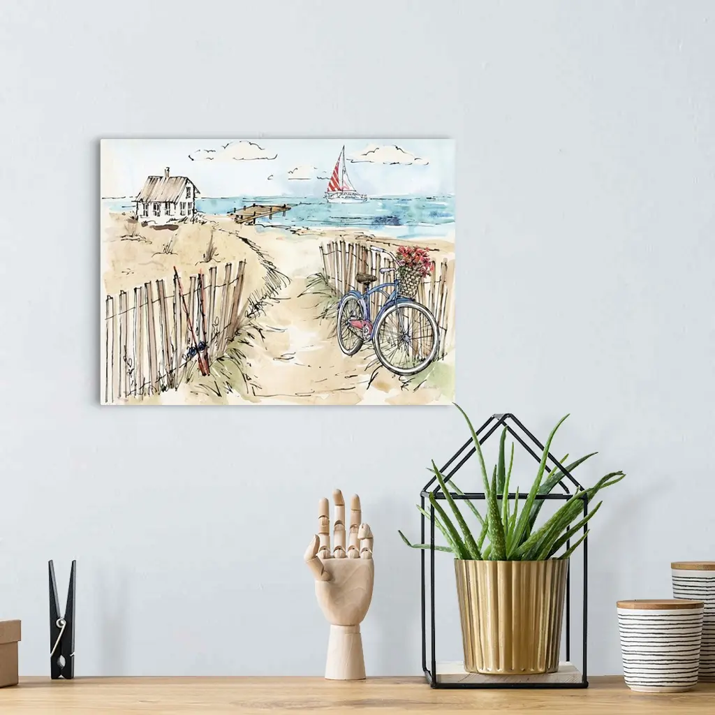Watercolor painting of a beach scene with a blue bicycle and fishing poles in the foreground and a sailboat in the background.