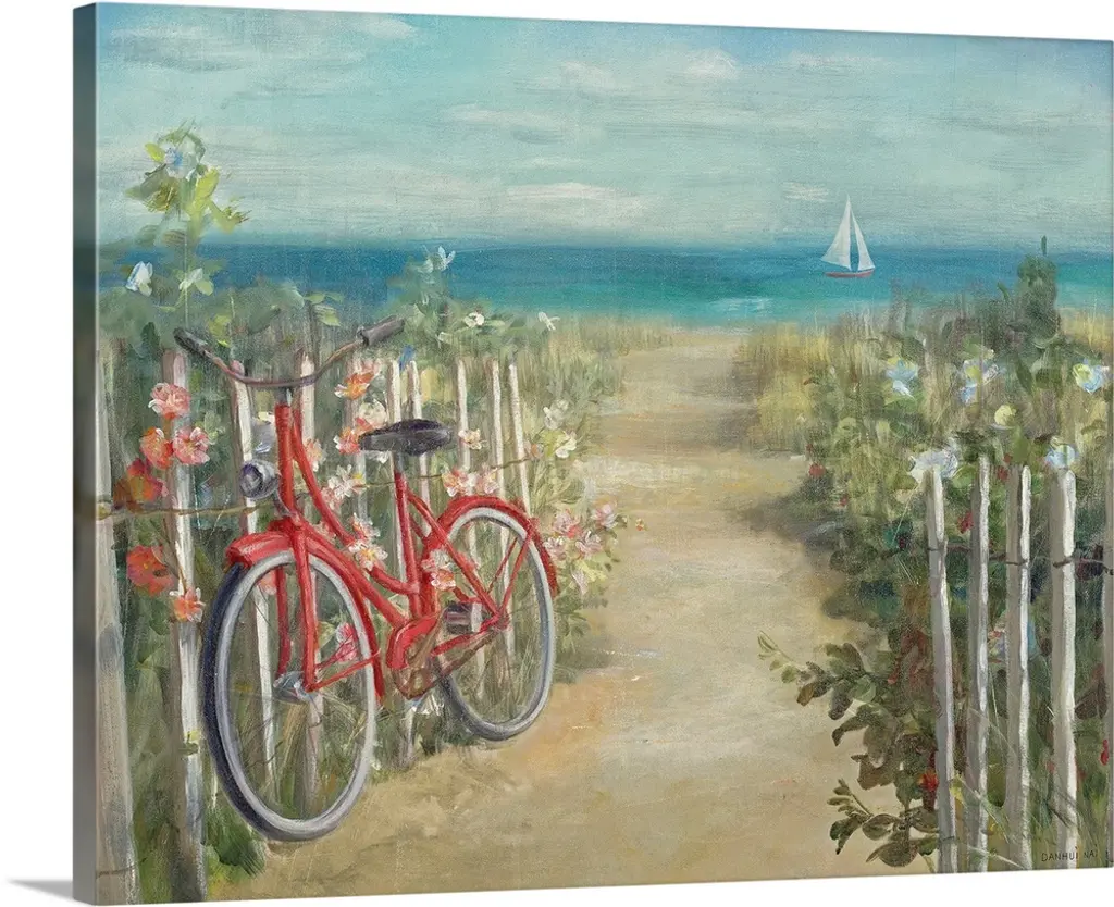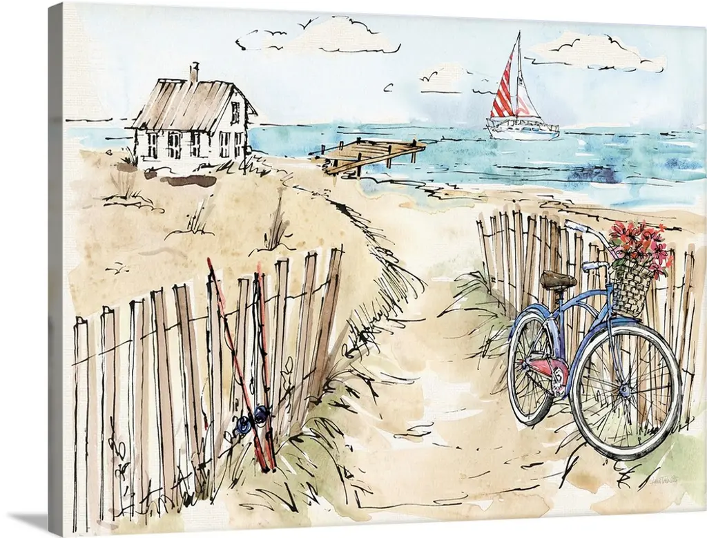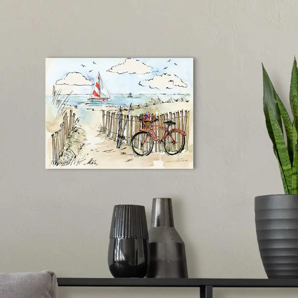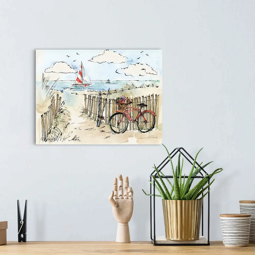 Watercolor painting of a beach scene with a red bicycle and fishing poles in the foreground and a sailboat in the background.