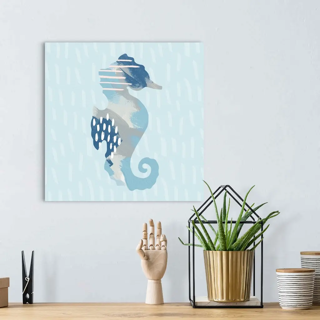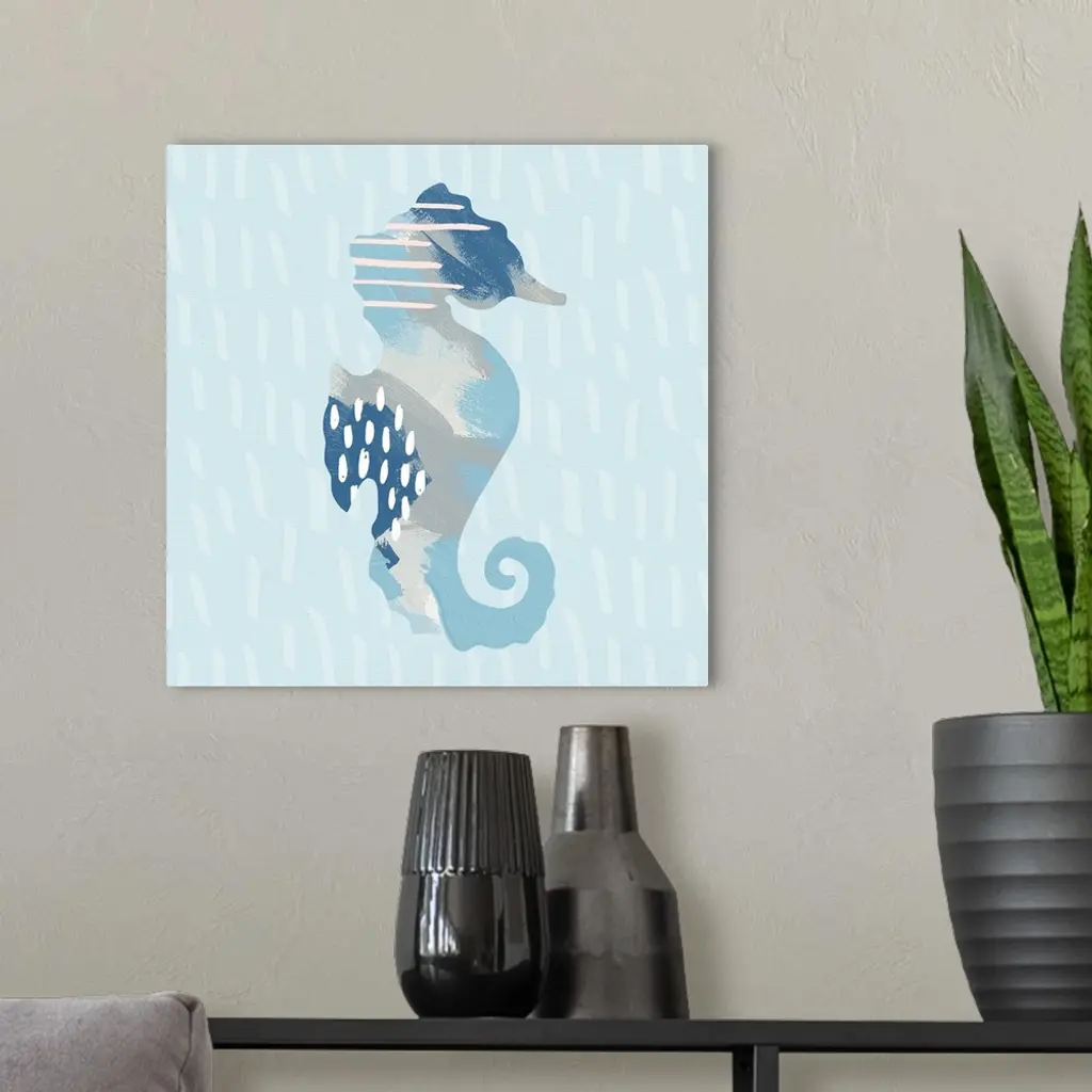 Decorative artwork featuring a sea horse silhouette made up of abstract shapes and designs over a soft blue background.