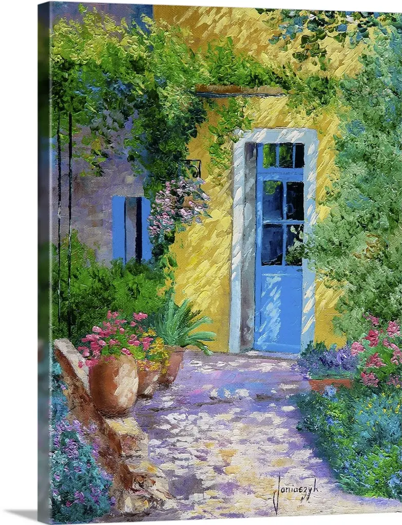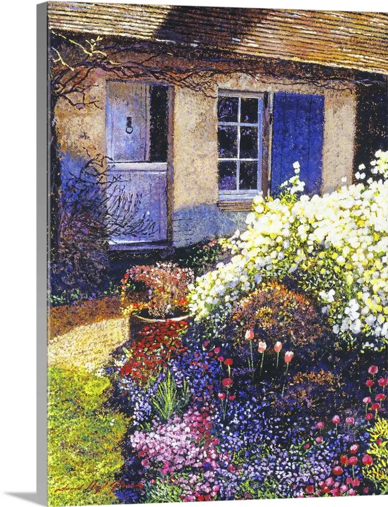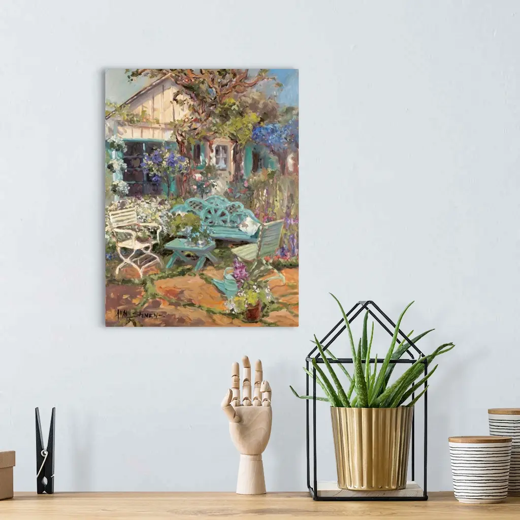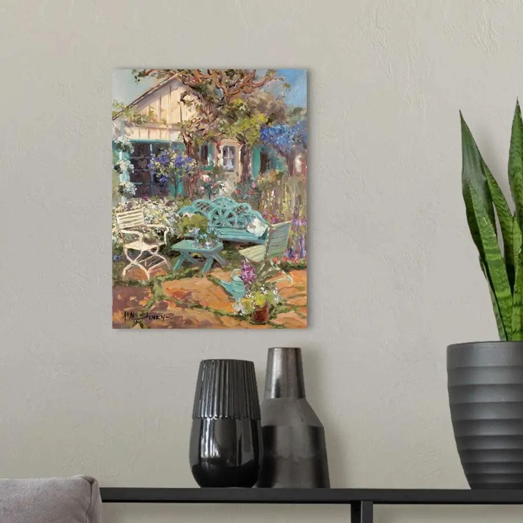 Fine art oil painting landscape of a front patio with flowers and plants by Allayn Stevens.