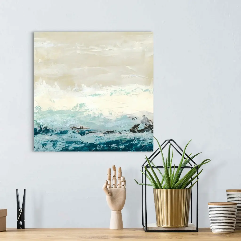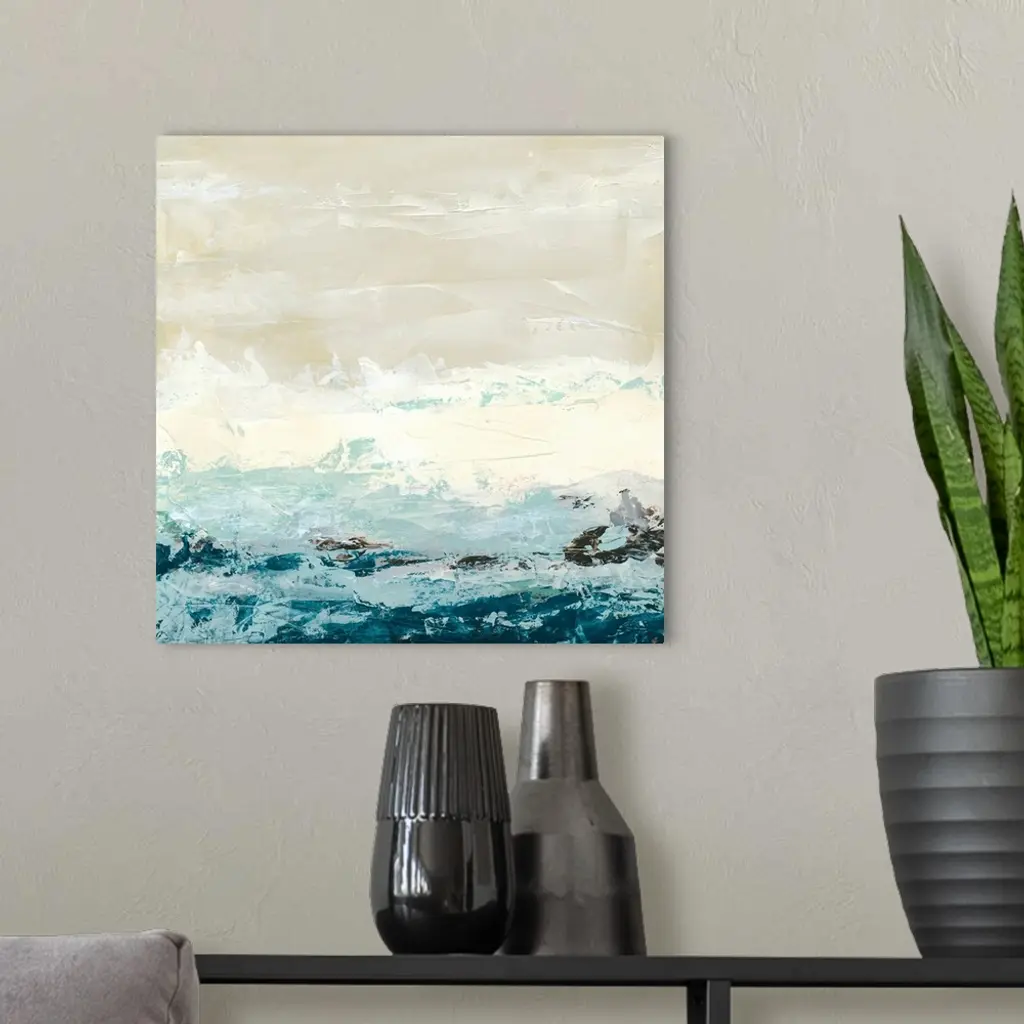 Square abstract painting of an ocean made up of large brush strokes.