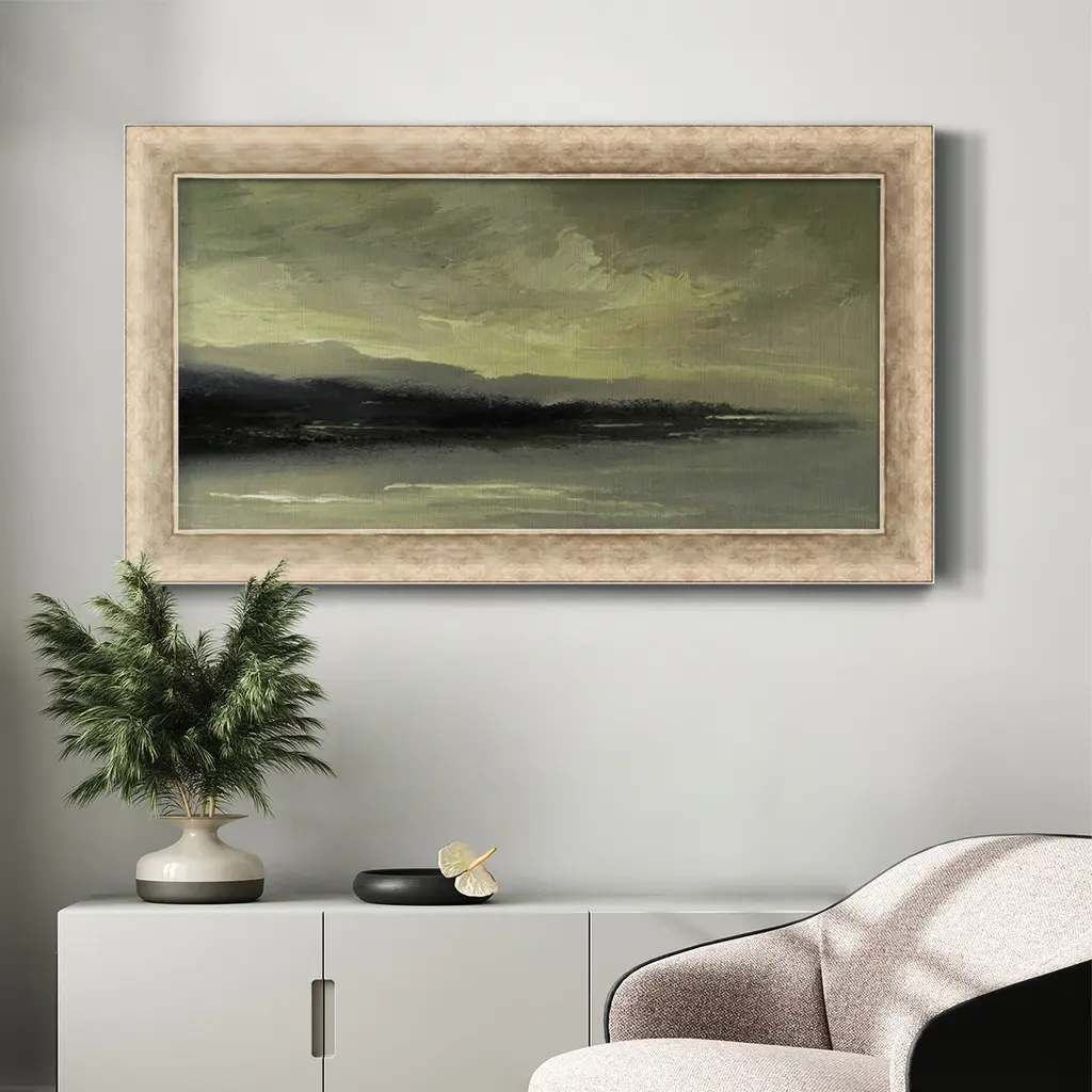 Coastal Dawn Premium Framed Canvas- Ready to Hang A Premium Framed Canvas created to last. Framed in distressed wood and available in an array of sizes and colors Featuring a beveled a solid wood stretcher bar, each piece comes ready to hand 3 SIZES AVAILABLE 21''X37'' - Overall Size 25''X45'' - Overall Size 29''x53'' - Overall Size Each piece is made to order. Each piece comes with hanging hardware. Made in the USA Ready to Hang Giclee Paper Print Acrylic Glass Beveled Matt Board