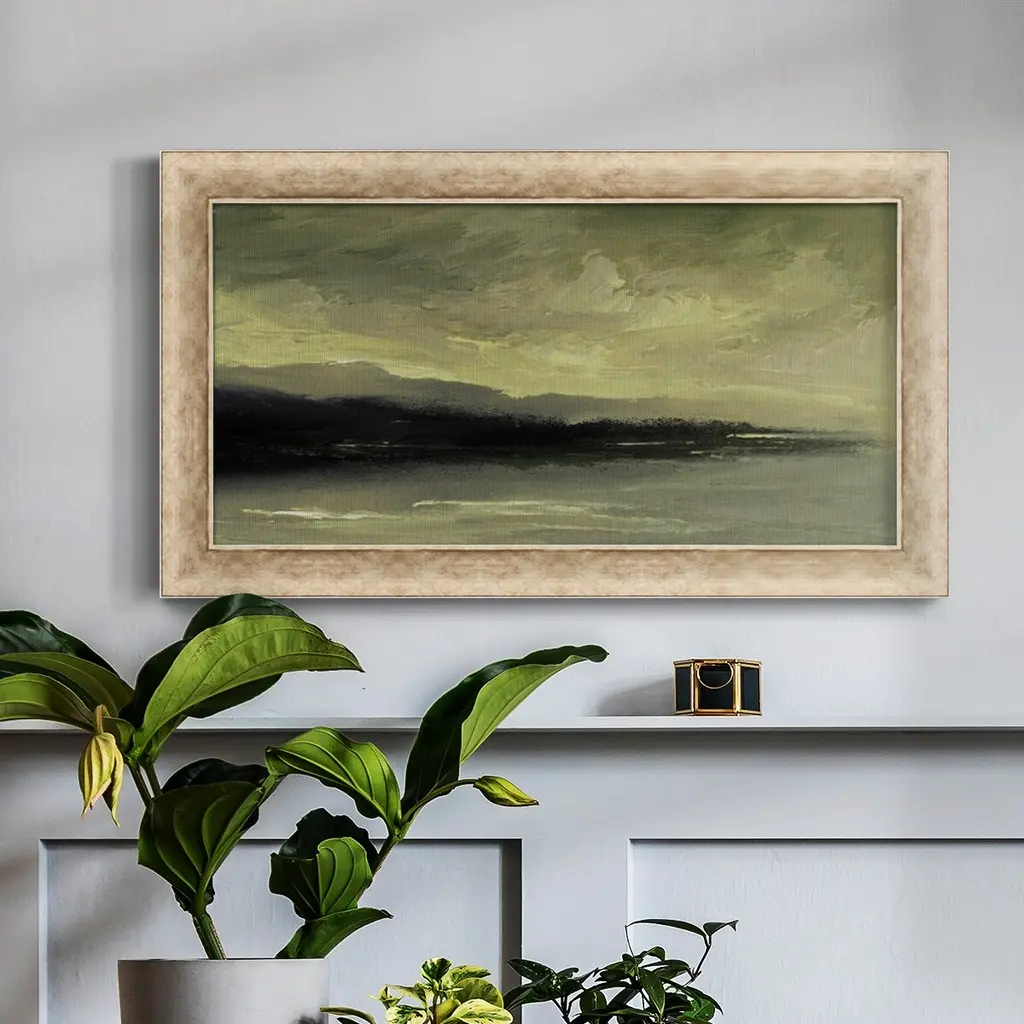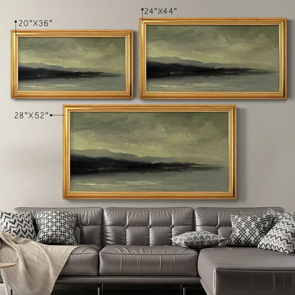 Coastal Dawn Premium Framed Canvas- Ready to Hang A Premium Framed Canvas created to last. Framed in distressed wood and available in an array of sizes and colors Featuring a beveled a solid wood stretcher bar, each piece comes ready to hand 3 SIZES AVAILABLE 21''X37'' - Overall Size 25''X45'' - Overall Size 29''x53'' - Overall Size Each piece is made to order. Each piece comes with hanging hardware. Made in the USA Ready to Hang Giclee Paper Print Acrylic Glass Beveled Matt Board