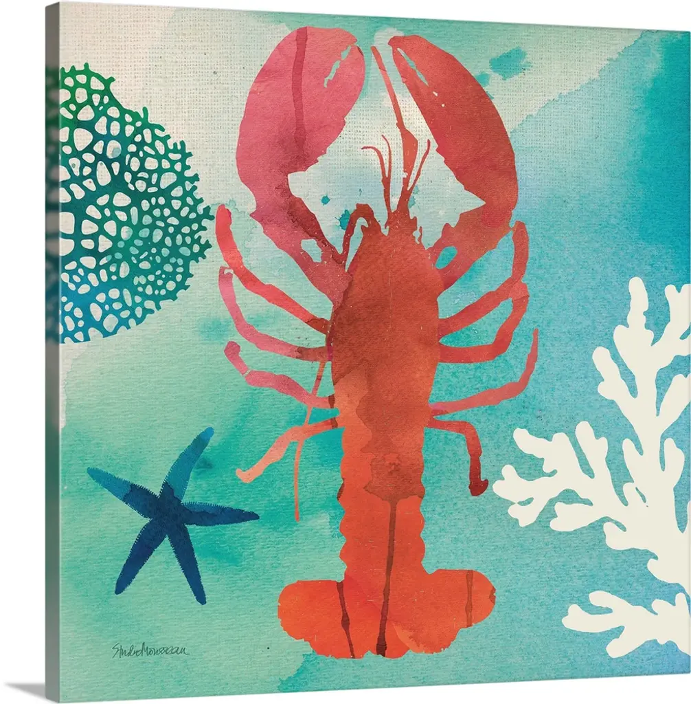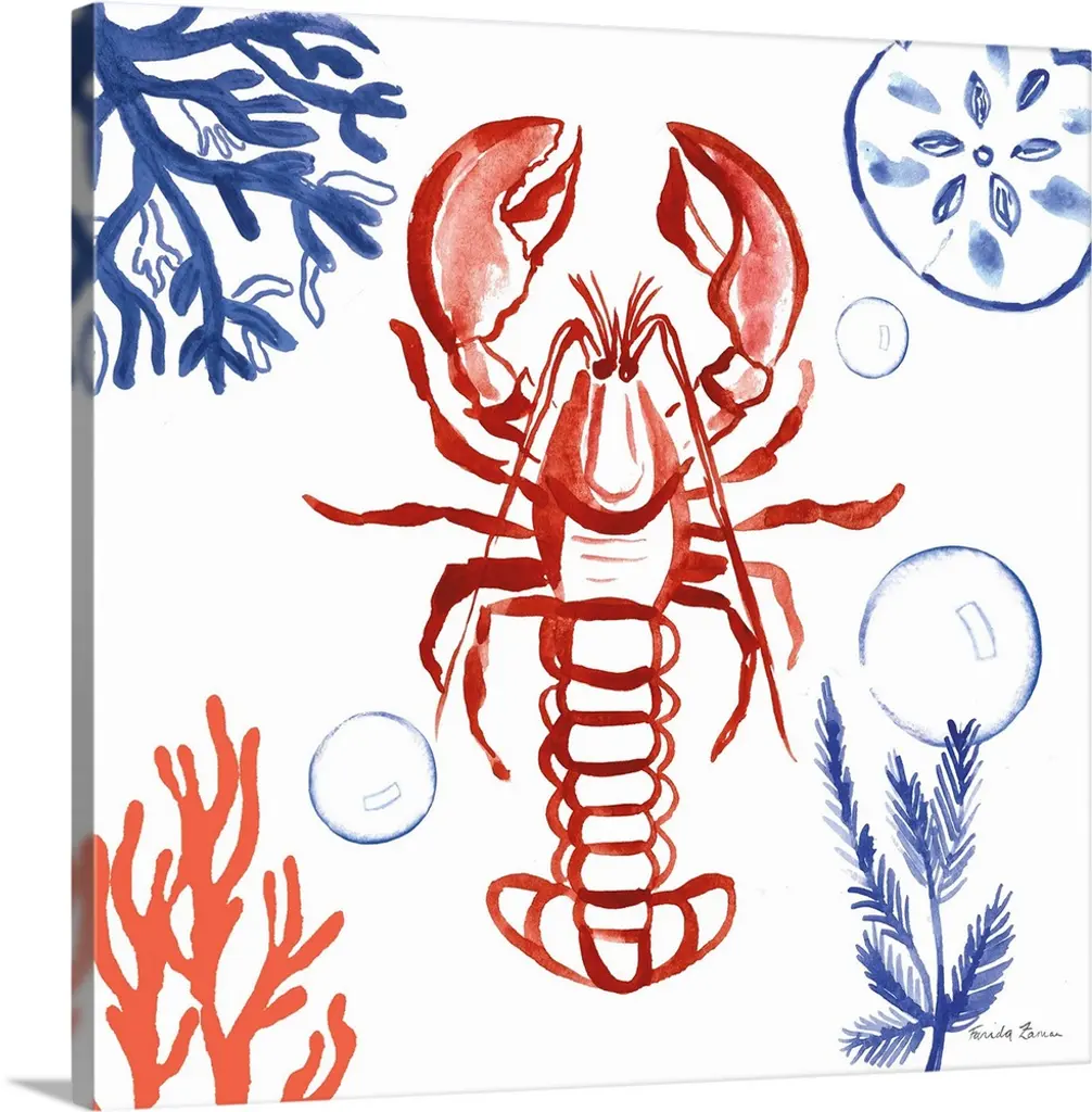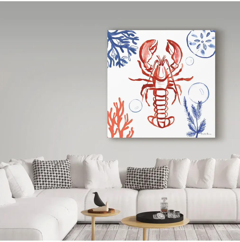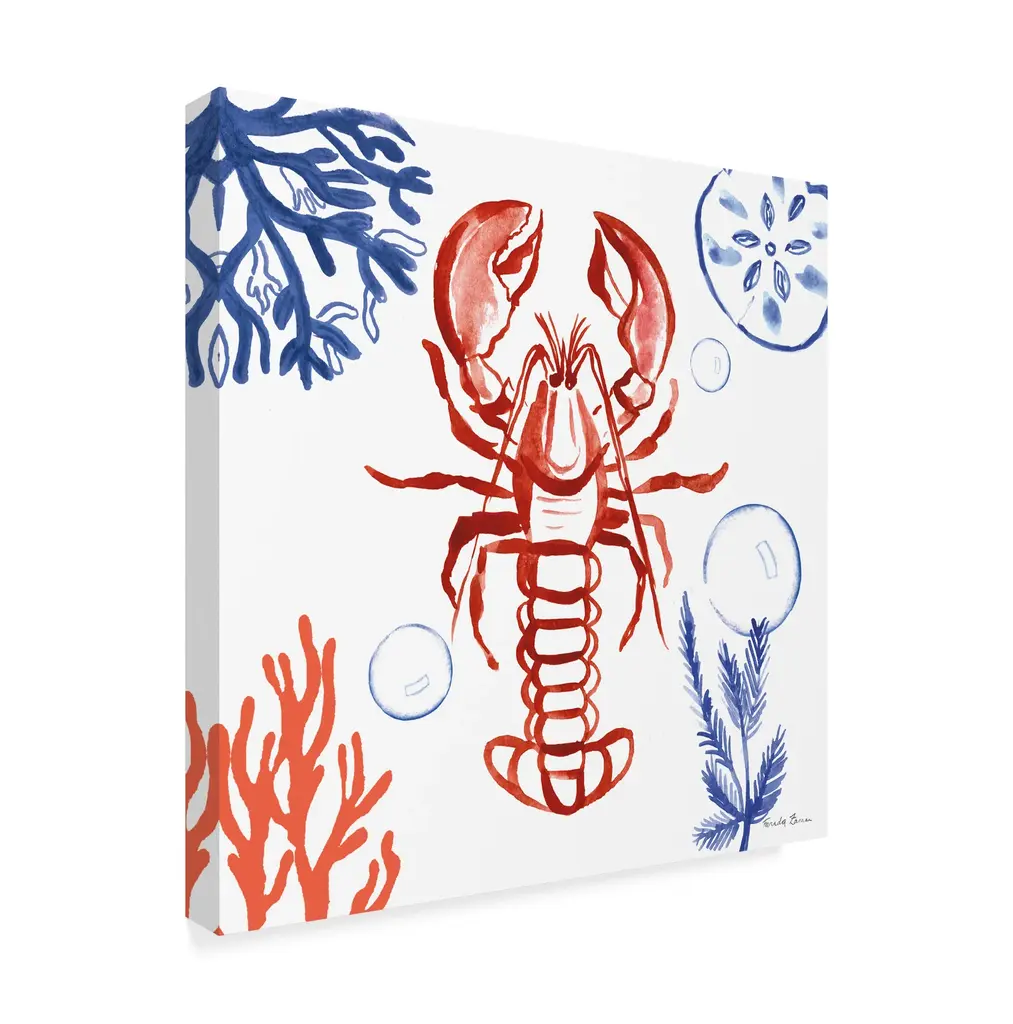 Artist: Farida ZamanSubject: AnimalsStyle: NauticalProduct Type: Gallery-Wrapped Canvas ArtMade in USAThis ready to hang, gallery-wrapped art piece features a lobster in the center of a white scene.Farida Zaman is a Toronto based painter and illustrator known for her upbeat, lively, colorful and whimsical style. She displays a wide versatility of applications of her style: her art has been used in posters, book covers, children's book illustrations, corporate projects, food packaging as well as licensing her images on giftware products, clothing, packaging, and giftware. Zaman's love of culture, travels throughout childhood, and recent trips to Morocco, Thailand, Turkey, Iran, and several European destinations influence the multicultural nature of her work. She is currently an instructor at Toronto's Avenue Road Art School and runs art workshops and weekly classes for adults and children in fine art and illustration.Giclee (jee-clay) is an advanced printmaking process for creating high quality fine art reproductions. The attainable excellence that Giclee printmaking affords makes the reproduction virtually indistinguishable from the original piece. The result is wide acceptance of Giclee by galleries, museums, and private collectors. Gallery wrap is a method of stretching an artist's canvas so that the canvas wraps around the sides and is secured a hidden, wooden frame. This method of stretching and preparing a canvas allows for a frameless presentation of the finished painting.Whether it's a contemporary, rustic, modern, or traditional style decor, Trademark Fine Art offers a variety of high-quality, carefully built wall art that will surely complement any style. We provide an abundance of art themes that range from fascinating abstracts to breathtaking landscapes, in an assortment of sizes that will certainly bring excitement to any area of your home. From the bedroom to the living room, or even the office, Trademark Fine Art makes professionally handcrafted, ready to hang wall decor that will be admired for years to come!IMPORTANT: Avoid buying counterfeit products and transacting with unauthorized sellers. Trademark Fine Art is committed to providing the consumer with the absolute best price and value on our entire line of products, which we ensure by applying a rigorous Quality Control process. Trademark Fine Art is a registered trademark protected by U.S. Trademark law and will be vigorously defended.