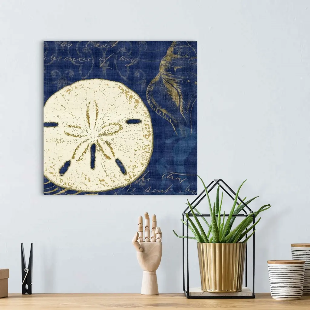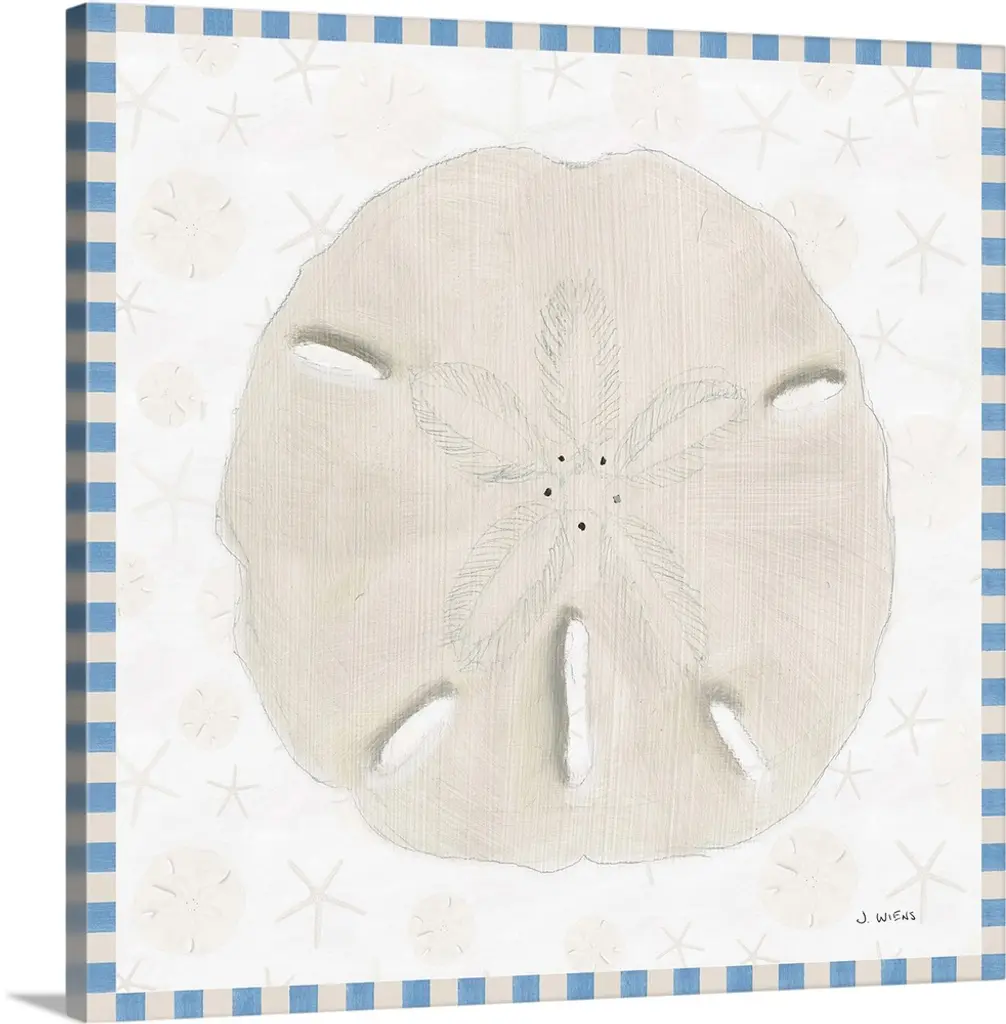 Contemporary artwork of a sand dollar with other types of sea life against a blue background.