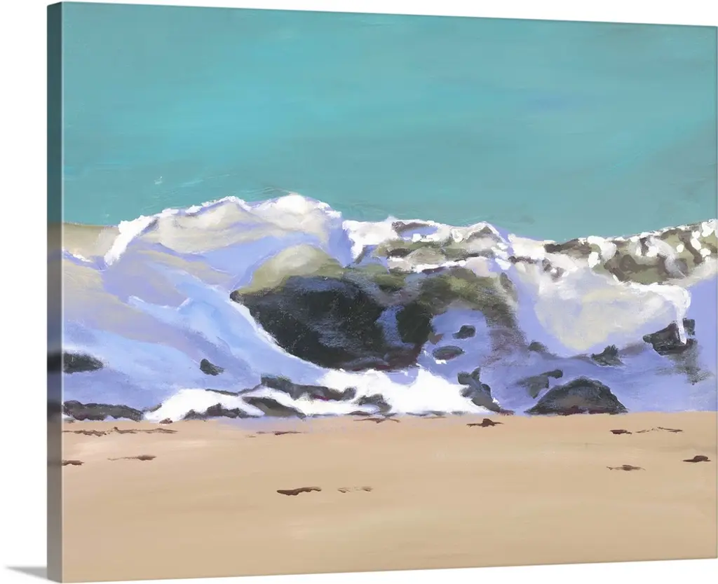 Contemporary painting of waves crashing against a rocky shore.