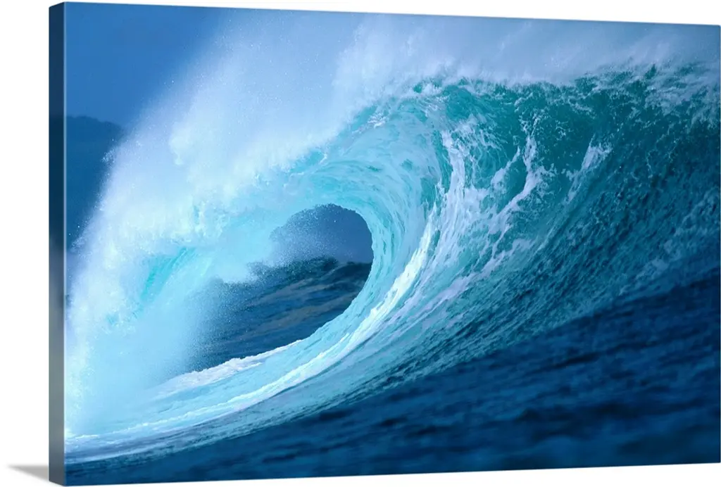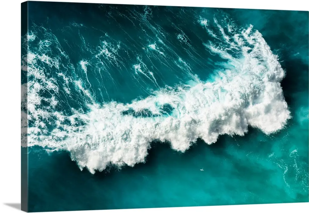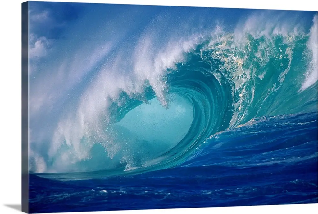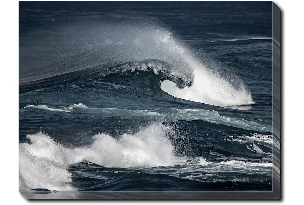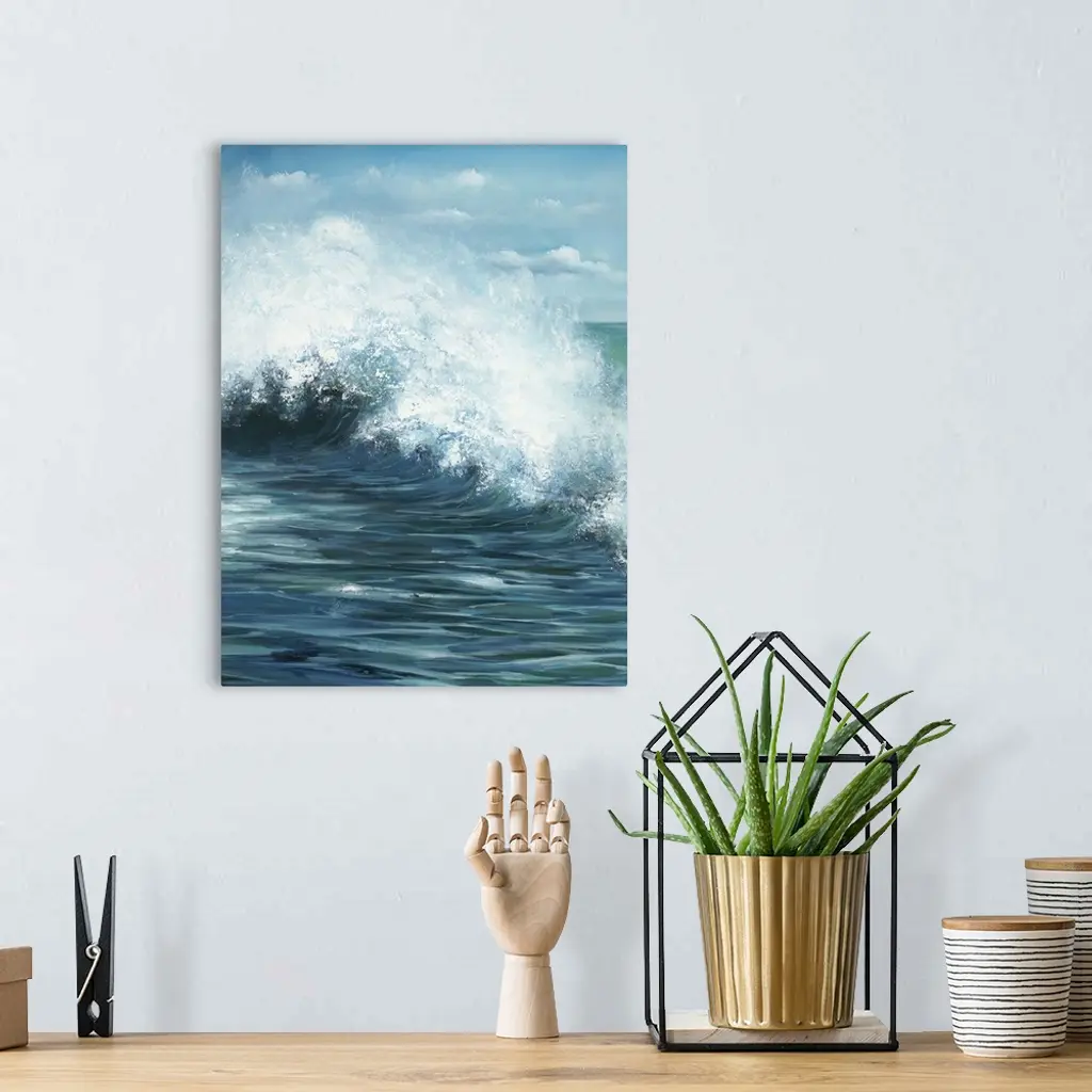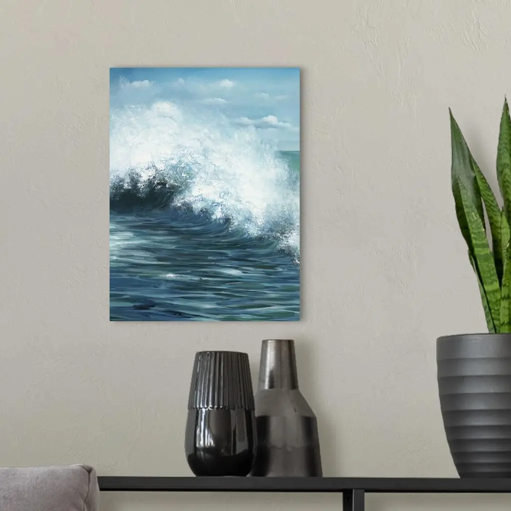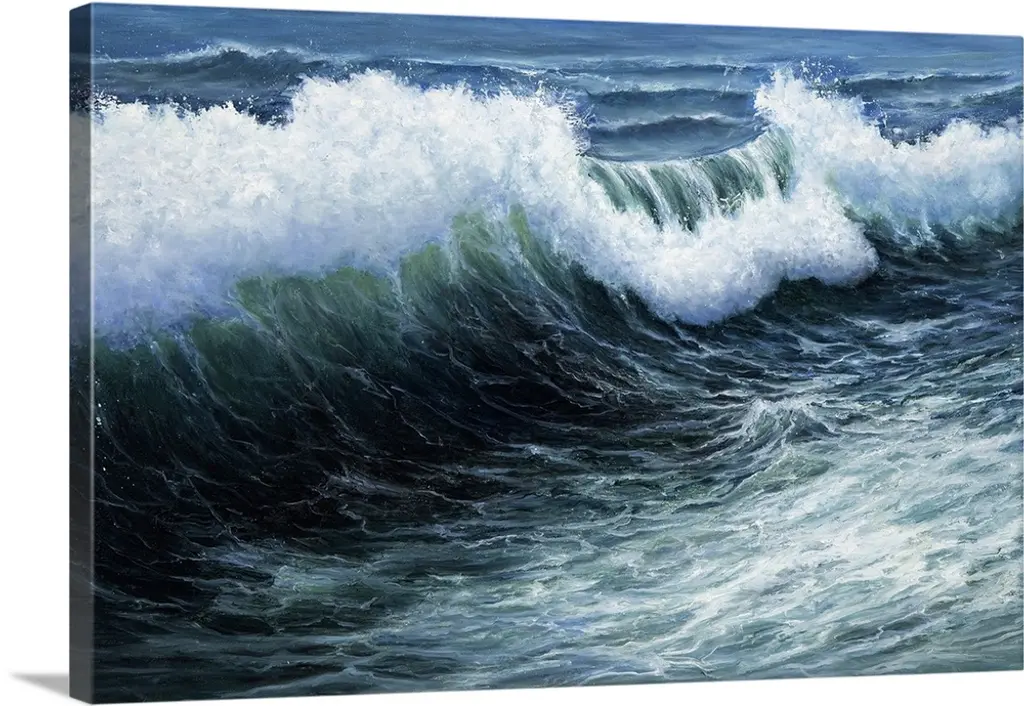 Contemporary artwork of a wave curling and splashing off the ocean.