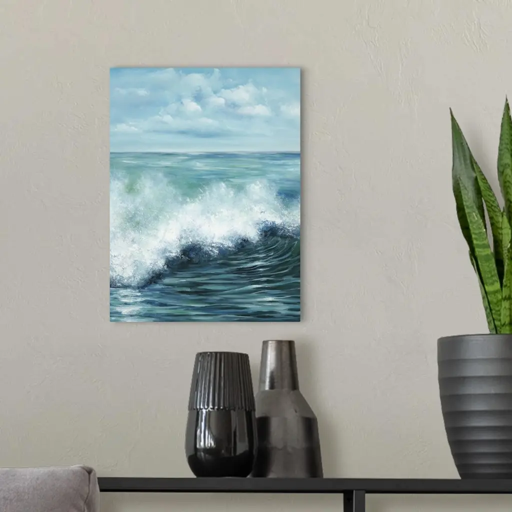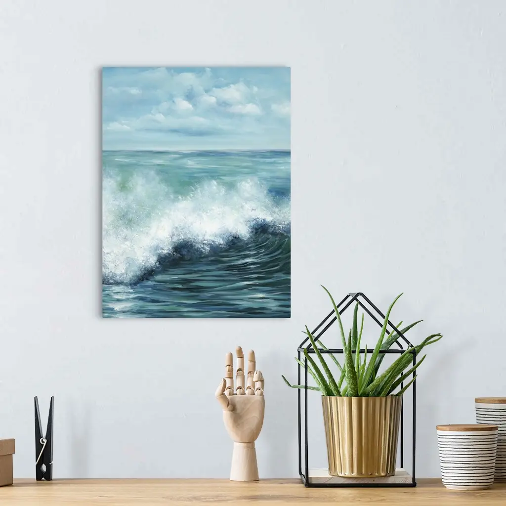 Contemporary artwork of a wave curling and splashing off the ocean.