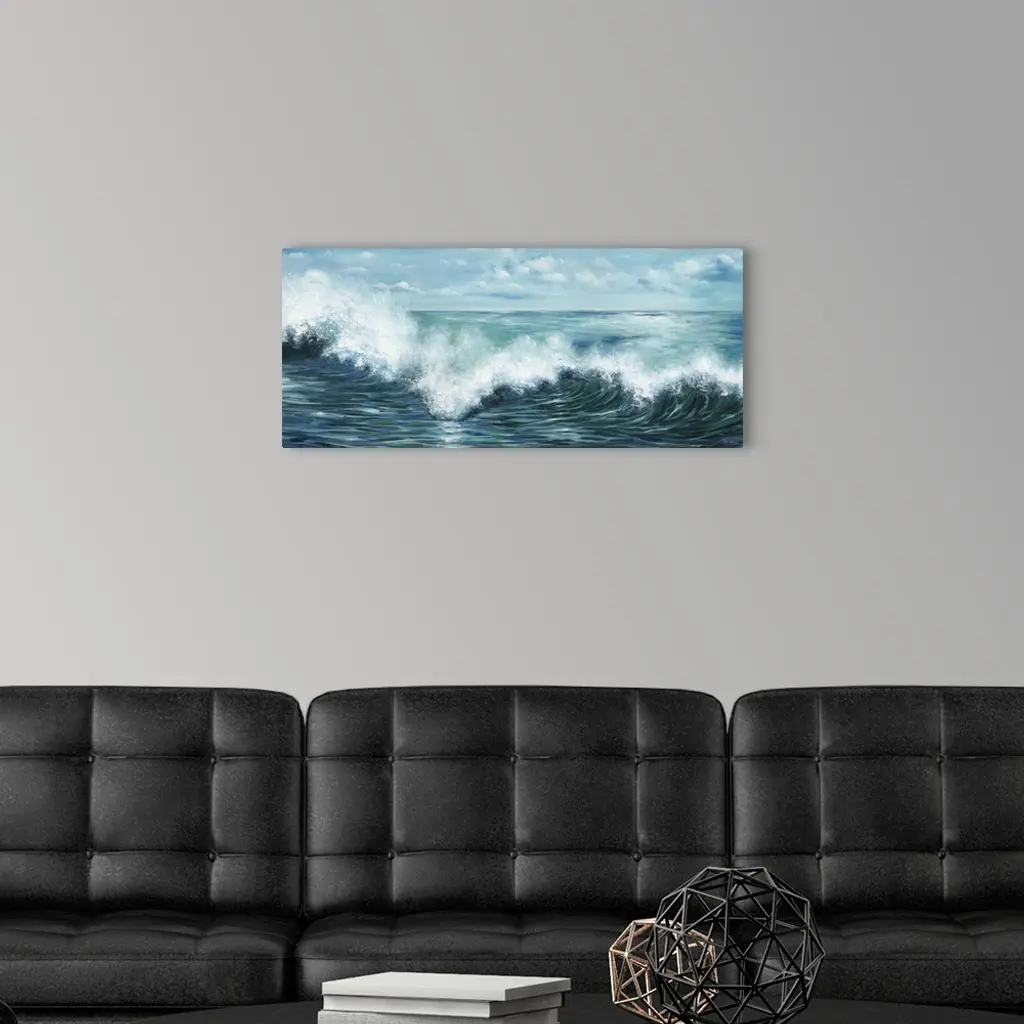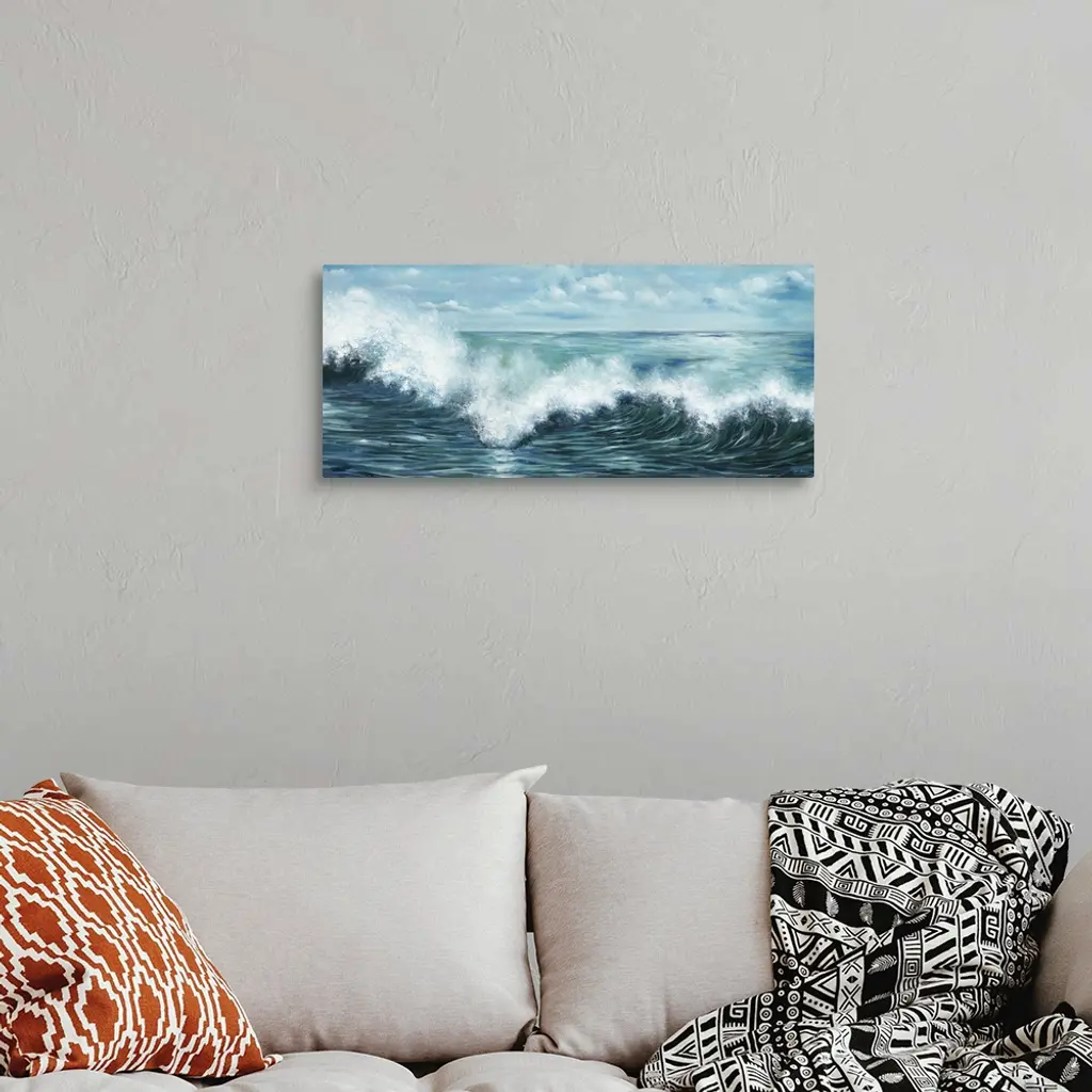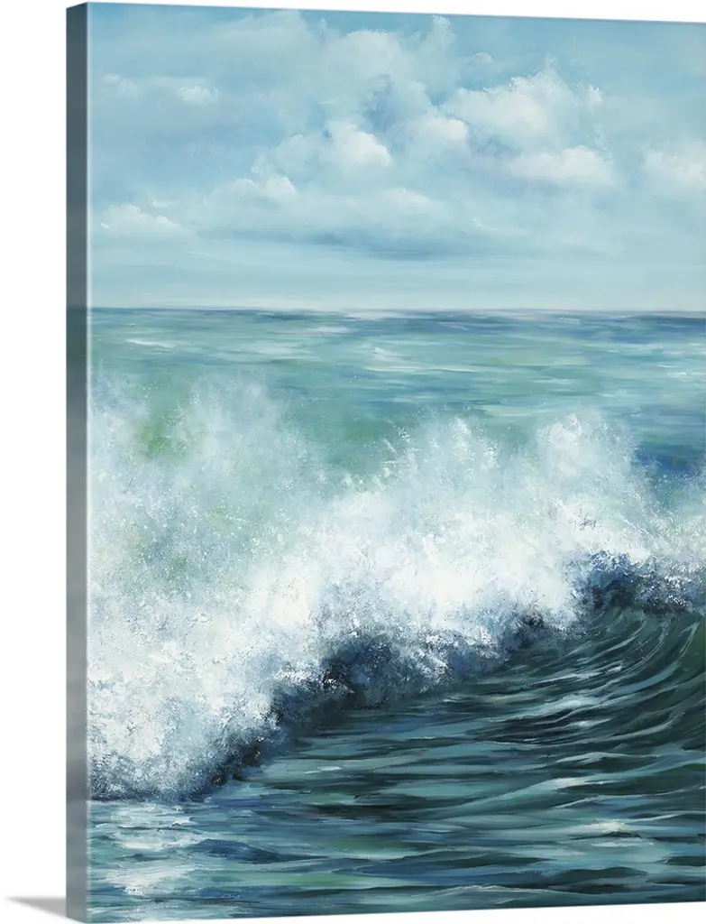 Contemporary artwork of a wave curling and splashing off the ocean.