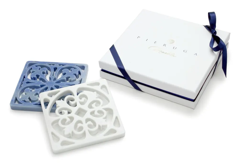 The Amalfi coaster inspired by the pattern of Majolica tiles represents all the Mediterranean flavor made of sea, sun, lemons and carefree laughter.Coaster in polished Azul Macaubas quartzite from Brazil.Thanks to their shape and size they can be used as coasters, bottle coasters, paperweight and little tasteful gifts.Dimensions: L 11, W 11, H 1 cm100% Made in Italy Each Amalfi coaster comes carefully wrapped in a beautiful Pieruga marble box.Material: Azul Macaubas.Marble is a natural material, every piece is unique as each marble block is different in veins and color shades. All of our creations are handmade by Italian artisans and can slightly vary in shape and size. This is to be considered as a guarantee of a handmade object.All Pieruga objects are made of precious and natural marbles and onyx. Marble is sensitive to acid-based liquids, especially a prolonged contact with substances such as wine, lemon, vinegar, fruit juices, cola and alcohol can stain the surface.Cleaning should be carried out with a soft sponge, water and neutral detergent. Do not use metallic or abrasive sponges, do not wash in the dishwasher, do not use in the microwave. The color of the marble after washing can undergo variations due to the humidity trapped in the surface’s micro-pores. Once fully dried it will regain its original color. The brass inlays tend to oxidize over time, to make them return to shine again use a soft cotton pad soaked in a solution of water and traditional Marseille soap, gently rub over the brass inserts and rinse the surface thoroughly. We are against the use of chemical products, all Pieruga objects are processed and polished through long manual processes without the use of polishing liquids.Pieruga proudly creates elegant accessories and complements in marble through artisanal processes, bringing into dialogue ancient techniques of sculpture with advanced technologies. 100% handmade in Italy.Our mission is a clear signal of opposition to the enormous waste that occurs in the extraction and processing of large blocks of marble, tons of material are discarded and thrown, in disfigurement to the generosity of our mountains.Rediscovering the ancient art of manual sculpture we give new life to even the smallest fragment of marble, bringing to light its millenary beauty that is lost in more than 2000 years of architecture and sculpture.Pieruga marble is a new brand by Barberini & Gunnell.The Atelier Barberini & Gunnell was founded by the architects and designers Francesco Barberini and Nina A. Gunnell.The artworks by Barberini & Gunnell are regularly shown at international art fairs, such as PAD London, PAD Genève, PAD Monaco, Salon Art + Design New York, Art Miami.IMPORTANT INFORMATION REGARDING SHIPPING:We carefully pack all artworks in strong wooden crates to ensure safe transport. This service is done directly in our atelier and is complimentary. All of our artworks travel with a shock watch system in order to monitorate rough handling by shippers and movers.