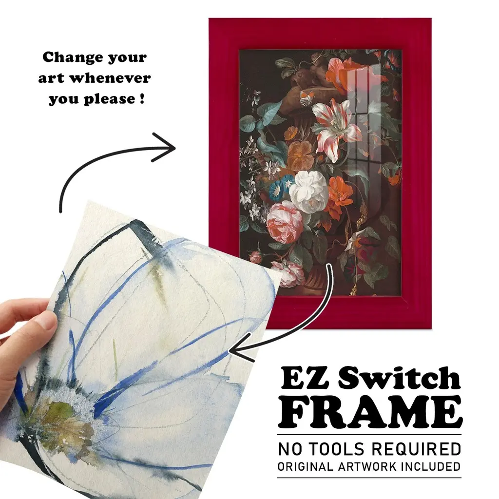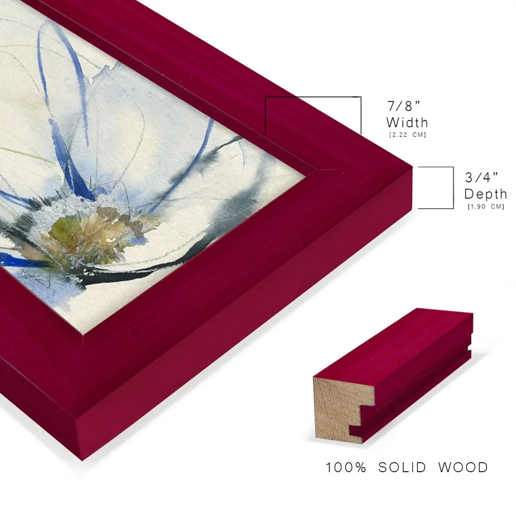 Cobalt & Paynes Petals II -EZ SWITCH Framed Print w/glass-Cherry Red A delightful, framed print. Featuring a solid wood frame with real wood glass. This premium print is giclee quality. In addition, every frame features a removable back and table top stand. This allows you to change your art in the future or to just stand the art on a table for a new look. We are sure you'll enjoy our new series of EZ SWITCH Framed Art. Solid Wood Frame Real Glass Removable / Replaceable Art Built in Tabletop Stand Sizes range from 4x6 up to 12x15 - buy just one or pair them up as sets as you see fit.