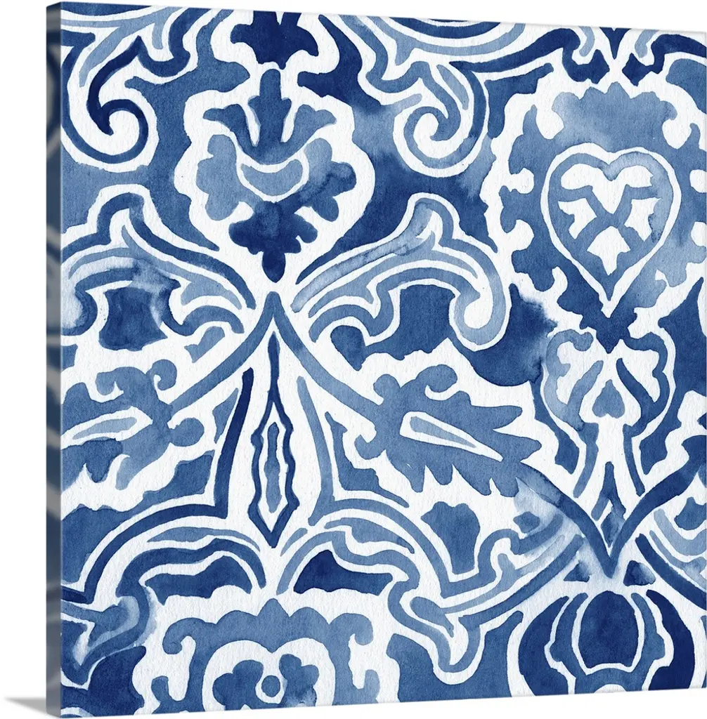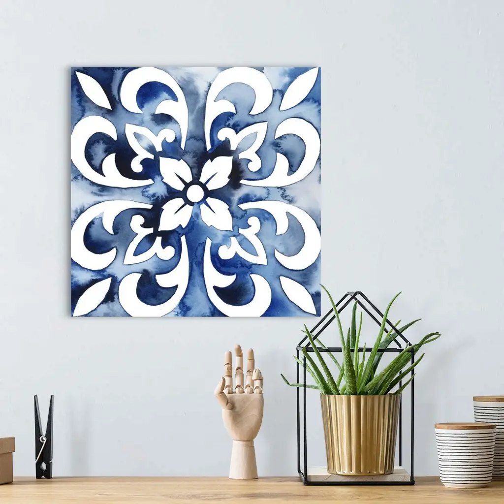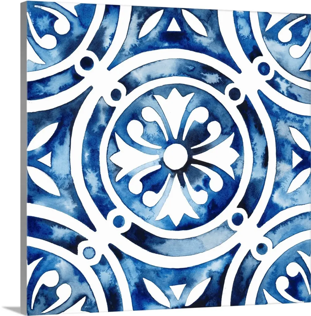 Watercolor painting of a floral tile design in blue and white.