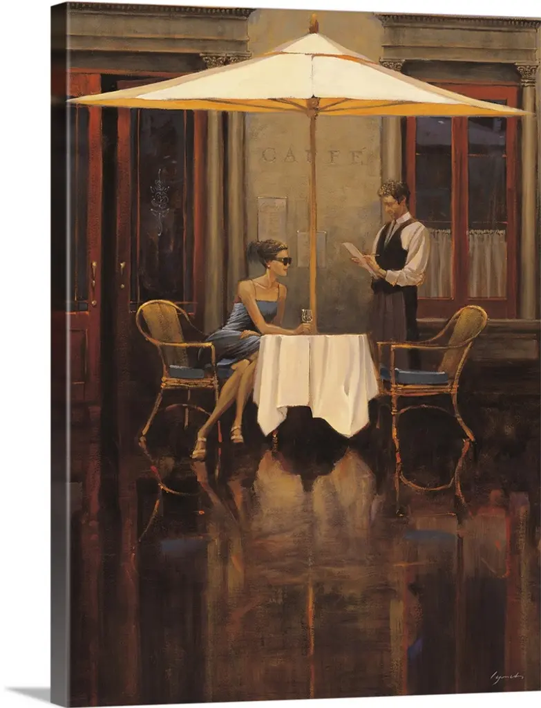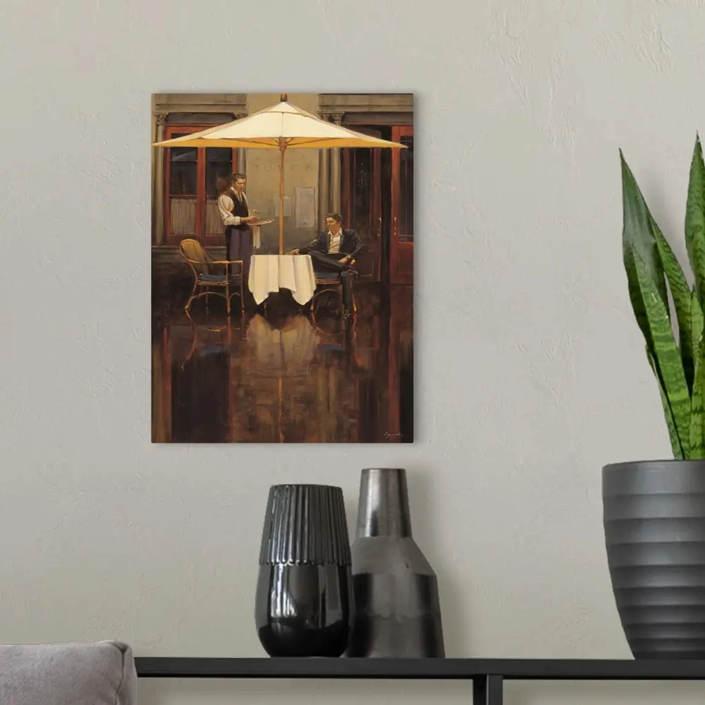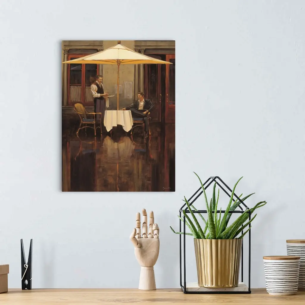 Contemporary painting of a man sitting at a table outside a bistro looking to his right.