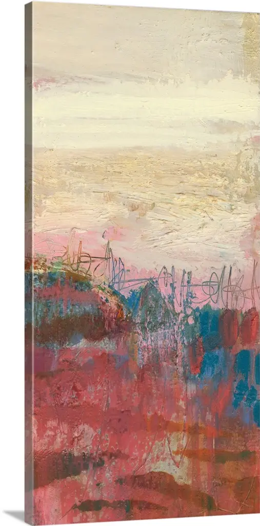 A vertical abstract painting that has a candy color palate with layered textures and colors divided into sections.