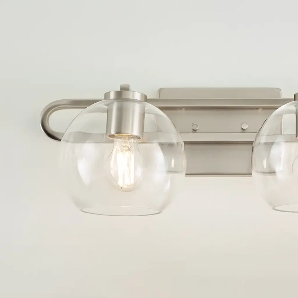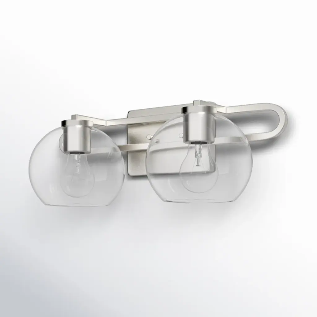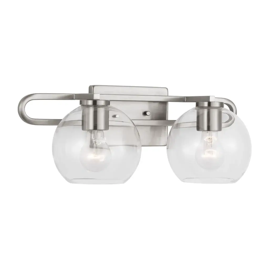 The Sea Gull Collection Codyn two light vanity fixture in Brushed Nickel is a contemporary take on a classic mid-century design. Clear glass shades with open-ended spheres accent the elongated keyhole strap detail, for a clean look. This minimalist collection relies on subtle details to create visual interest
