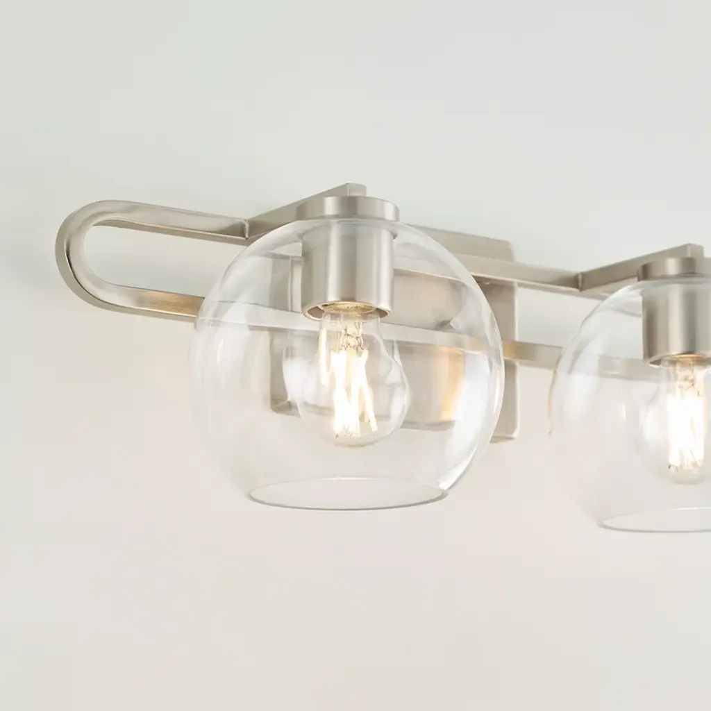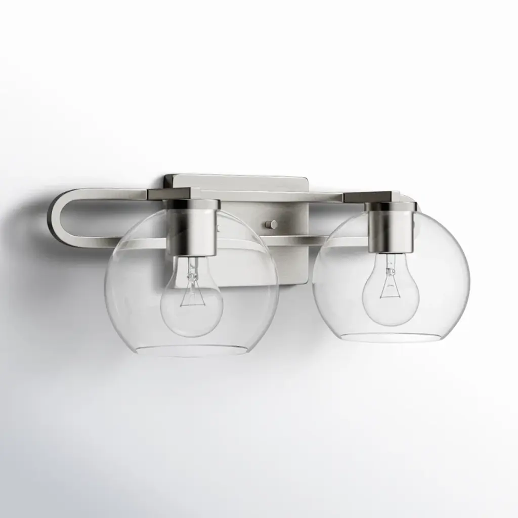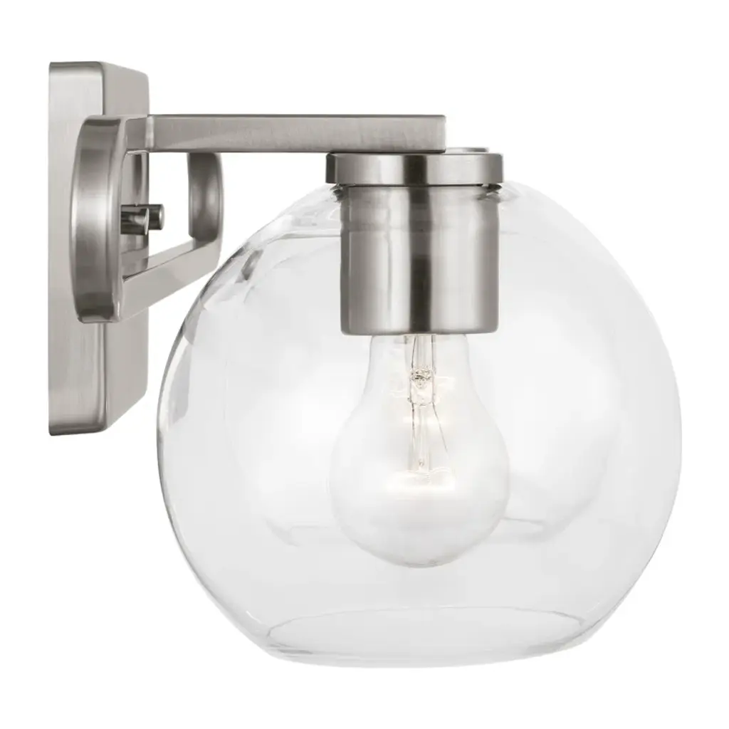 The Sea Gull Collection Codyn two light vanity fixture in Brushed Nickel is a contemporary take on a classic mid-century design. Clear glass shades with open-ended spheres accent the elongated keyhole strap detail, for a clean look. This minimalist collection relies on subtle details to create visual interest