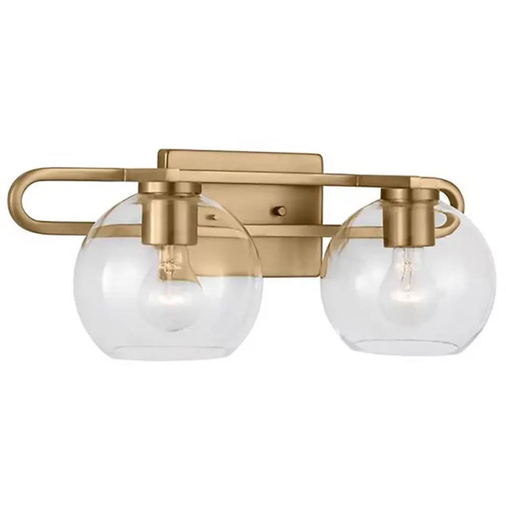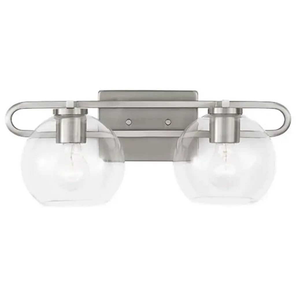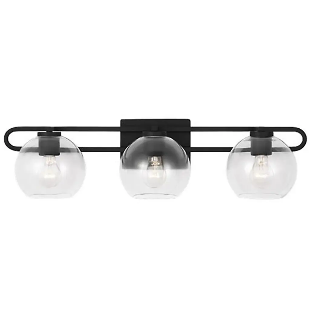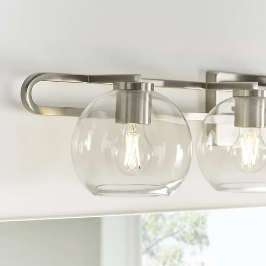 Capture the old with the new as stunning clear glass globe shades create a gorgeous glow. The Codyn Vanity Light from Visual Comfort Studio, formerly known as Sea Gull Lighting, features a five-light single-tier chandelier in a contemporary take on a classic mid-century design. Clear glass shades with open-ended spheres accent the elongated keyhole strap detail for a clean look. This minimalist fixture relies on subtle details to create visual interest.