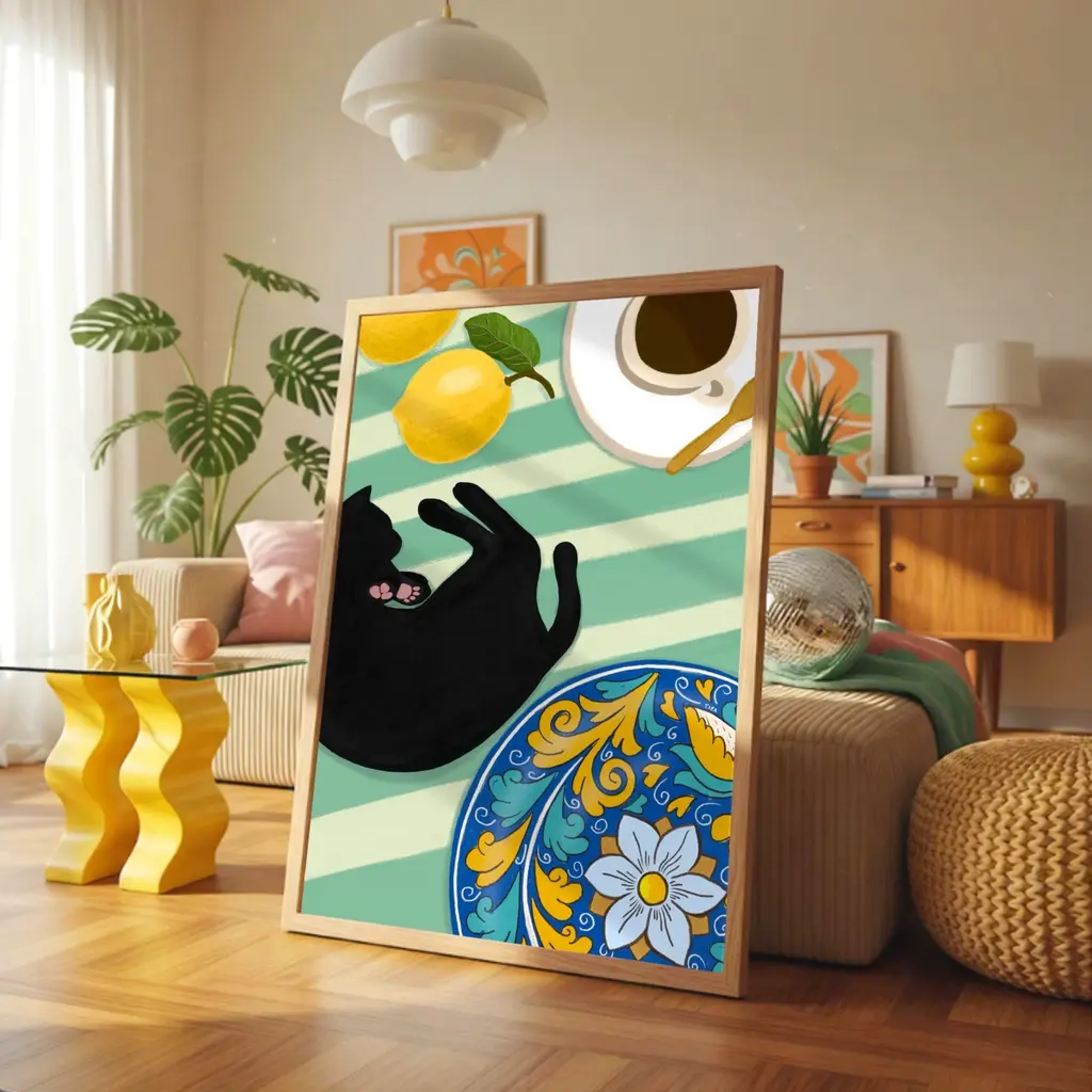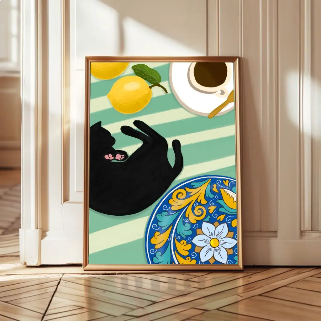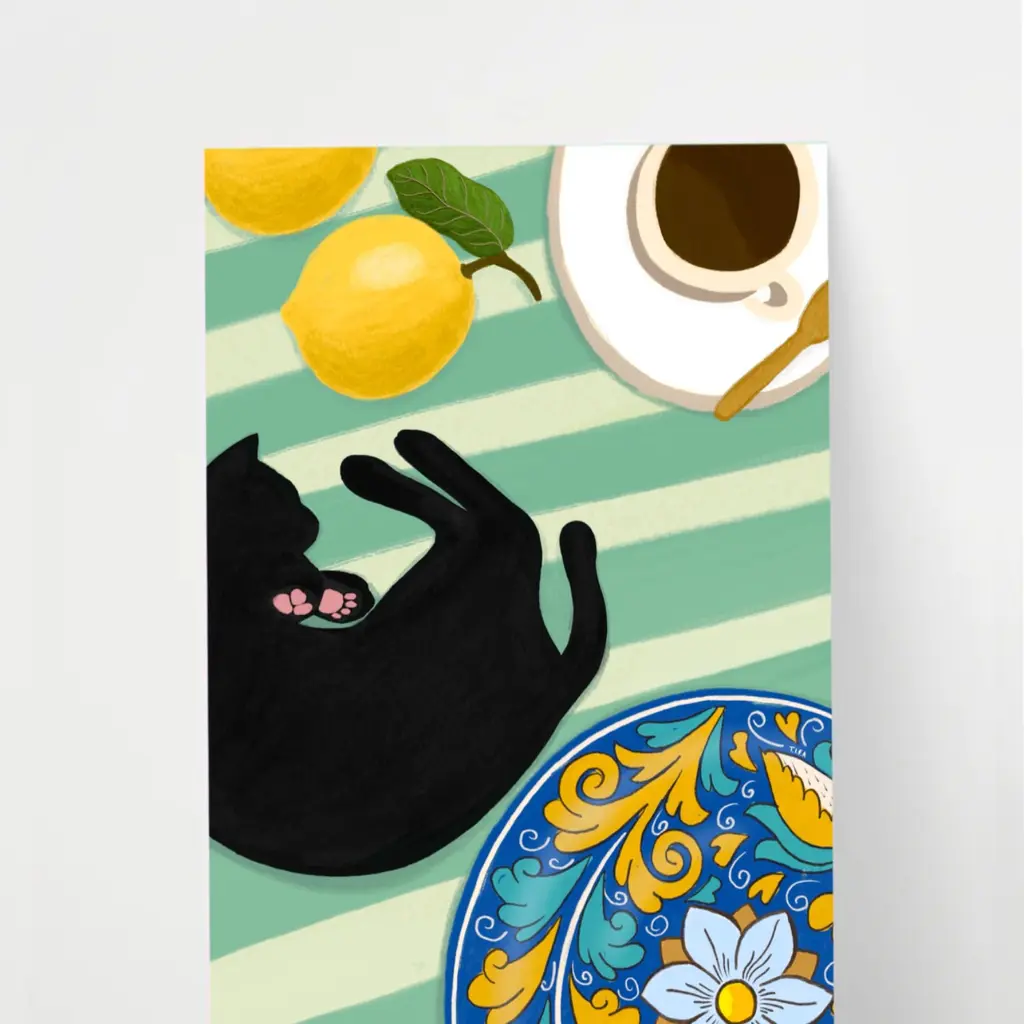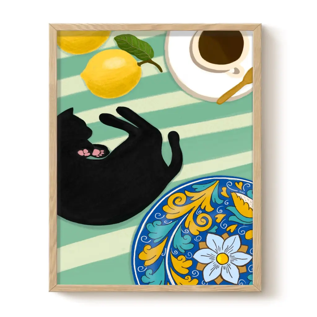 Coffee And Lemons - Cat Art Print - MediumIllustrated by Maria. This print is perfect for all cat lovers alike! Printed in the U.K.Printed on premium matte, fine art, archival paperPaper weight: 230 gsmSold without a frame.