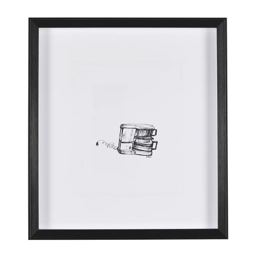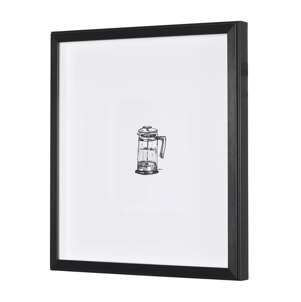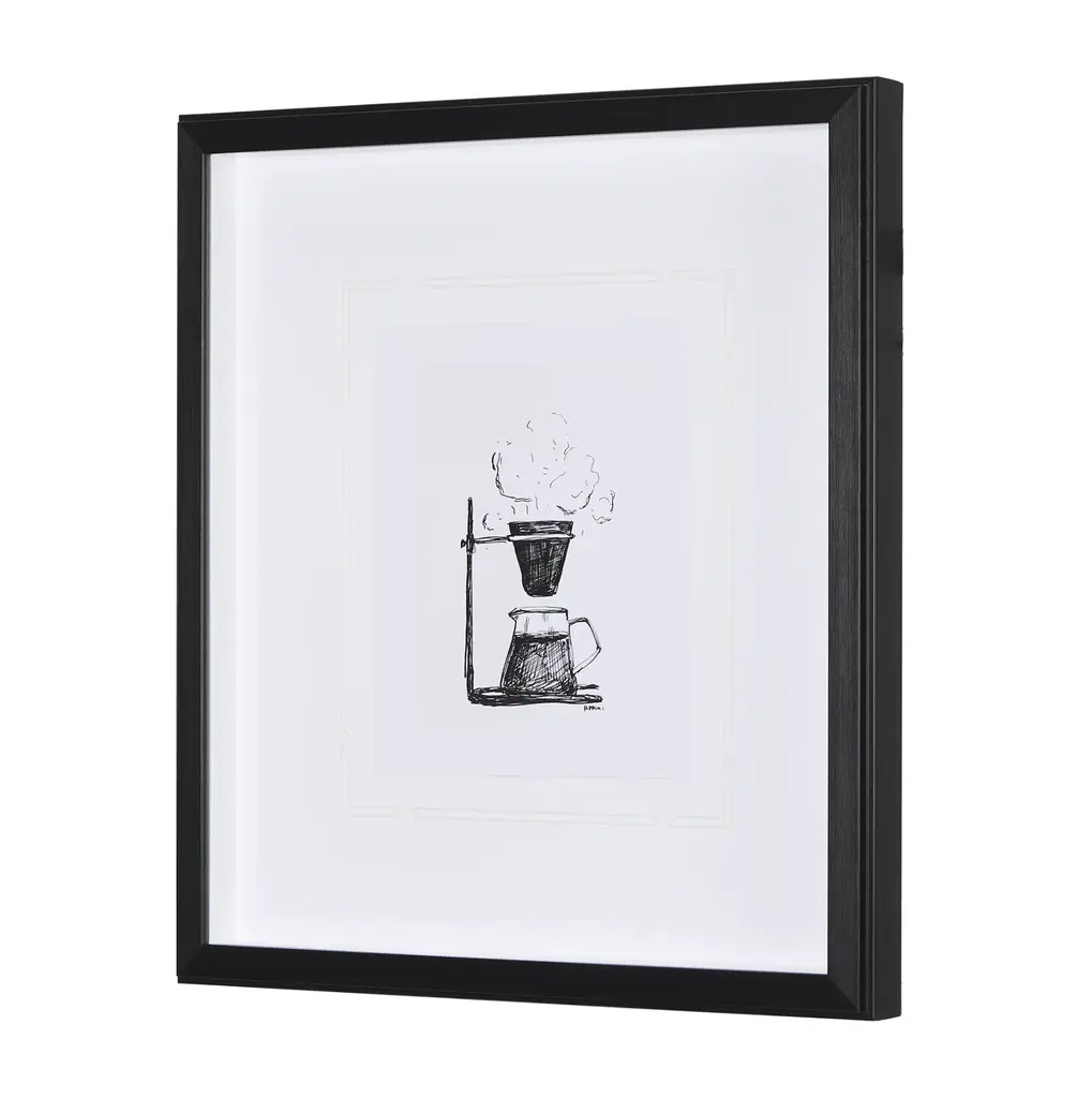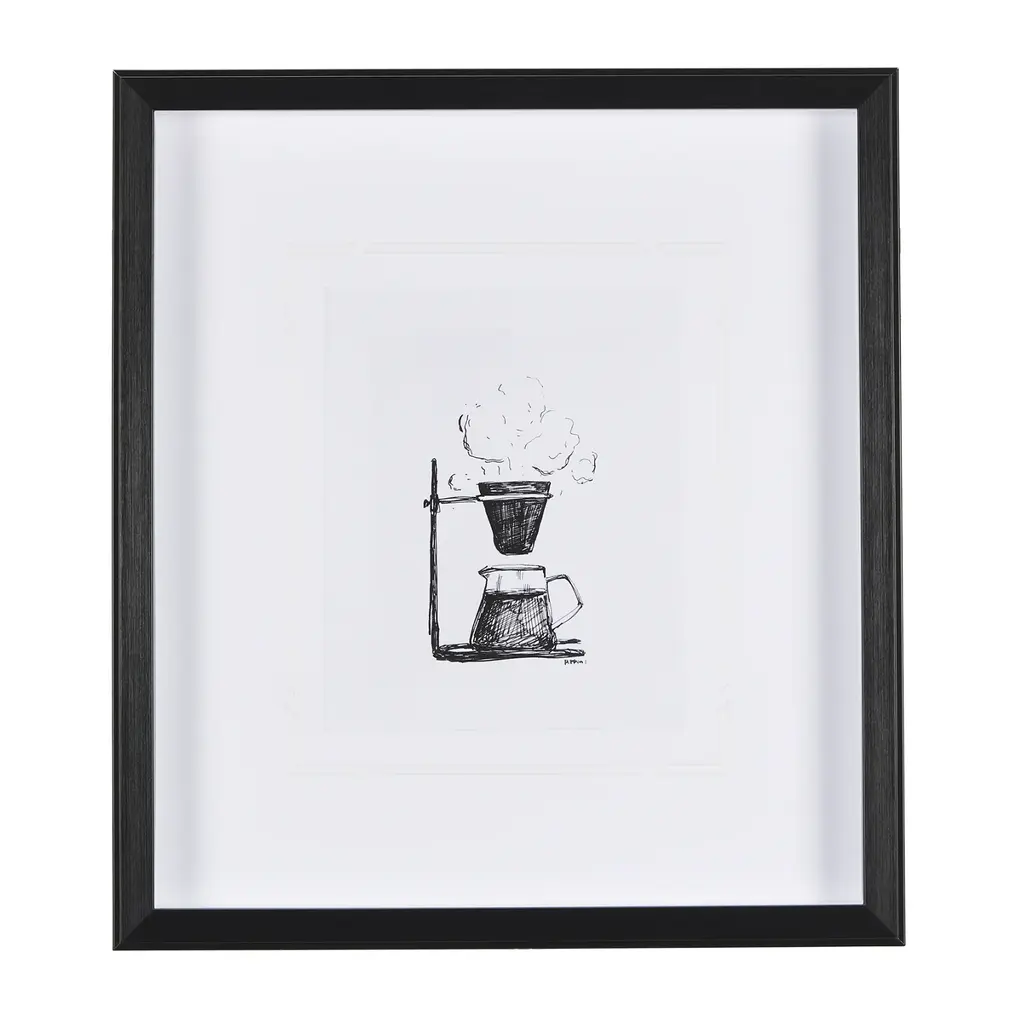 The Coffee collection features detailed ink drawings showcasing various brewing methods on a crisp white background. This monochromatic, minimalist artwork highlights clean lines and striking contrasts. Each print is framed and hand-finished to enhance texture and depth.