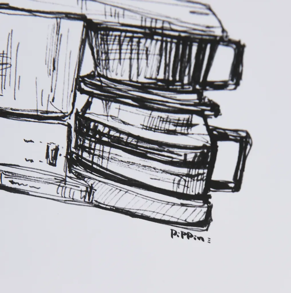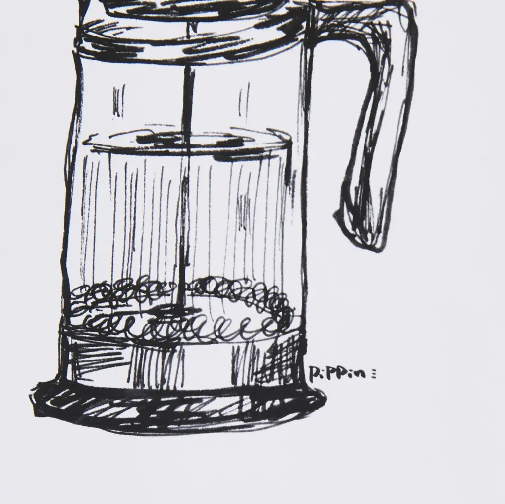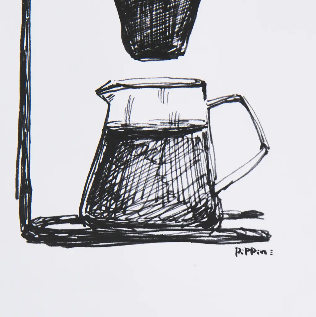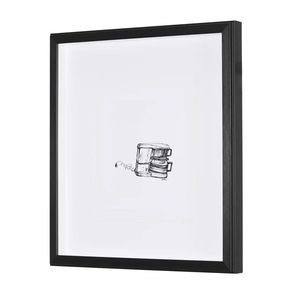 The Coffee collection features detailed ink drawings showcasing various brewing methods on a crisp white background. This monochromatic, minimalist artwork highlights clean lines and striking contrasts. Each print is framed and hand-finished to enhance texture and depth.