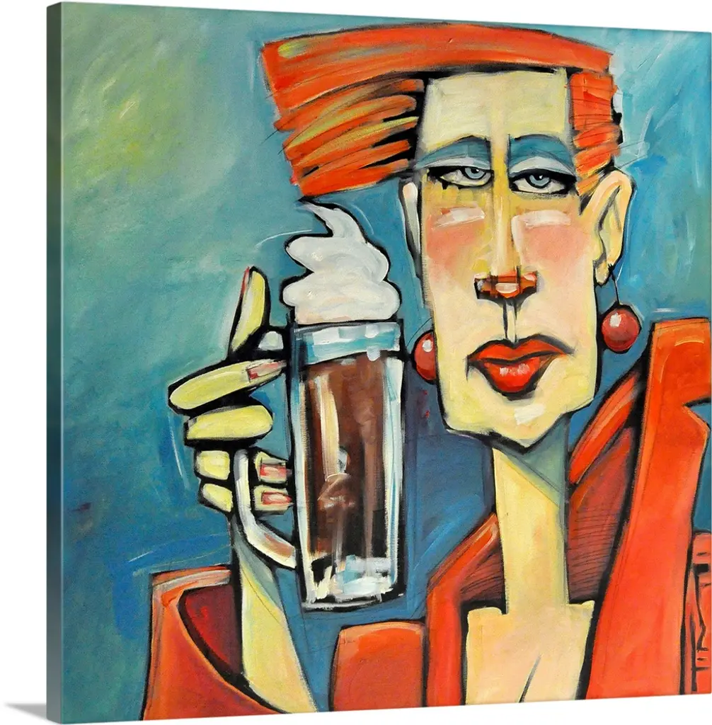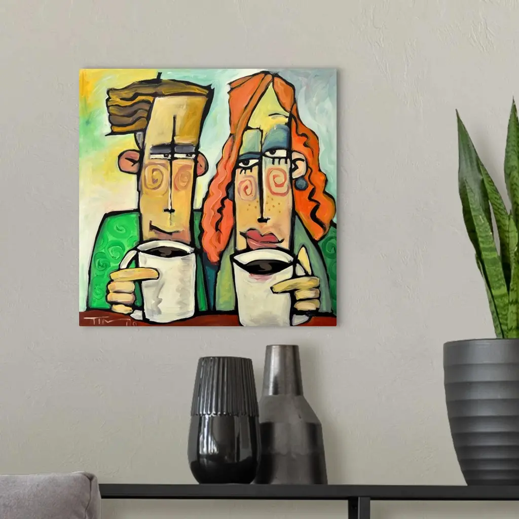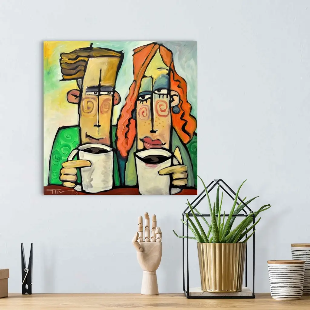 Square painting of two cartoon like figures enjoying mugs of coffee.