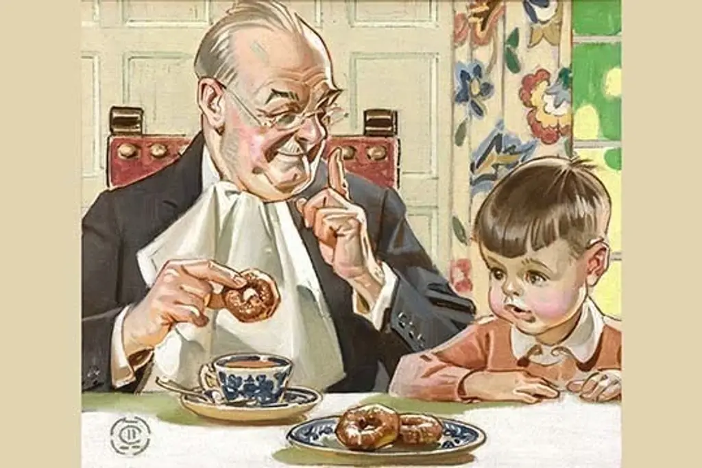 A grandfather shows his grandchild how to dip donuts and shows the hush sign as he doesn't want the parents to know he's giving the treat to the little boy. Taken from a magazine ad for the Pan American Coffee Bureau.