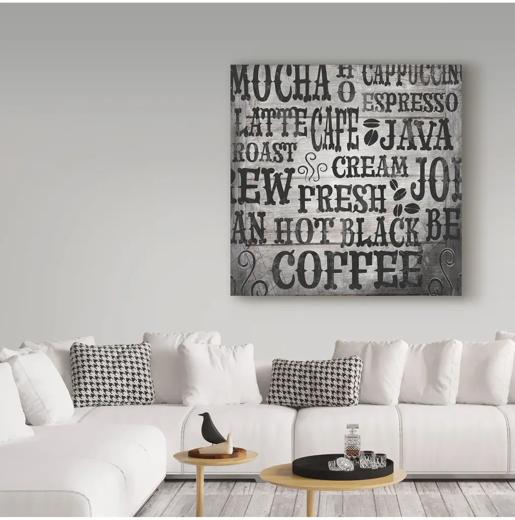 Artist: LightboxjournalSubject: TypographyStyle: Modern & ContemporaryProduct Type: Gallery-Wrapped Canvas ArtMade in USAThis ready to hang, gallery-wrapped art piece features a collage of phrases about coffee.From the moment I picked up my first camera, I have had to fuel a flame that continues to spark in creative photography, alternative printmaking, mixed media processes and contemporary art. With a strong educational background in Photography and Fine Art, my passion continues to grow. My inspiration and desire for photography have connected me to art in a way that is not explainable in words. I can only show others through the lens of my camera how I see and feel about the world that I live in today.Giclee (jee-clay) is an advanced printmaking process for creating high quality fine art reproductions. The attainable excellence that Giclee printmaking affords makes the reproduction virtually indistinguishable from the original piece. The result is wide acceptance of Giclee by galleries, museums, and private collectors. Gallery wrap is a method of stretching an artist's canvas so that the canvas wraps around the sides and is secured a hidden, wooden frame. This method of stretching and preparing a canvas allows for a frameless presentation of the finished painting.Materials: Canvas: 100% Cotton, Stretcher Bars: Poplar