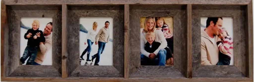 Collage Frames are such a unique and versatile framing medium, and our rustic multi-opening frames are a perennial favorite. There are dozens of ways to hang them and so many unique things you can put inside, that every frame we ship ends up being a one-of-a-kind heirloom. Unique Christmas gifts are just one of the possibilities you'll create when you invest in barnwood collage frames for your friends and family. Product Specifications: Four, each accommodates one 5x7 photo Exterior Dimensions: Approximately 33 inches wide by 11 inches high by 1.5 inches deep. Reclaimed barnwood Glass and hanging hardware are included Hang vertically or horizontally Made in USA Collage frames are also called multi-opening frames. They are a unique method for hanging several portraits at the same time. For example, a simple portrait of a baby in a series of fun poses makes the perfect holiday gift for a doting Grandmother. Fill one with your favorite artwork. There are dozens of beautiful ways to turn a rustic collage frame into unique wall decor. Country Kitchen Wall-Hanging: The design of this unique frame allows you to remove the glass and insert 3-D items in place of photos. Your barnwood frame can be painted any color, so it can be turned into delightful wall decor for a child's bedroom, a craft room, or a country kitchen. Hang the frame vertically, as shown, or hang it horizontally. There are so many fun ways to use a four-opening multi frame! Family Photos: A collage frame is a perfect way to showcase your favorite family memories Create a Memory Keepsake: Frame photos of that beloved family pet, of a grandfather who has passed away, or friends from your old neighborhood. Holiday Wall Hangings: With a little creativity, you can turn this frame into a one-of-a-kind holiday wall hanging. Add your own handmade holiday cross stitch. Put in letter cutouts to spell the word SNOW. Insert holiday-themed greeting cards, bats and witches for Halloween, wooden cutouts of pilgrims for Thanksgiving, cherished tree ornaments for Christmas. Switch the scene every season. The possibilities are endless. View our other collage frames for more great ideas.Natural imperfections may occur in this product.