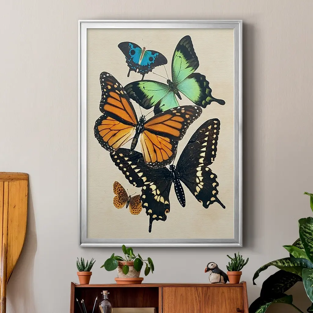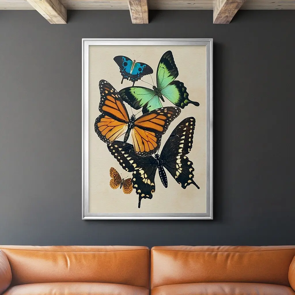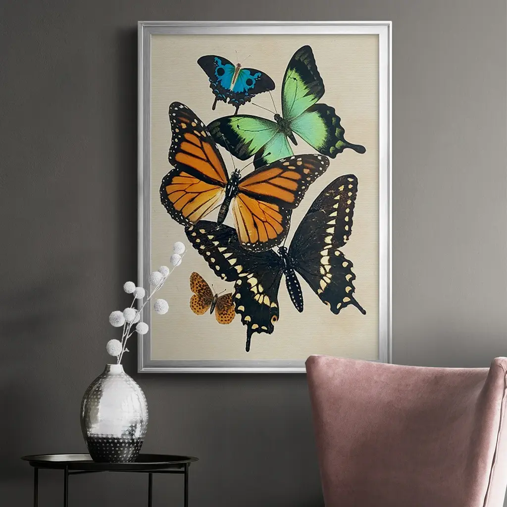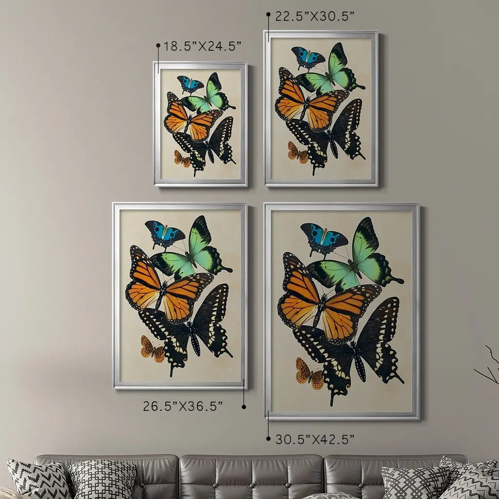 Collaged Butterflies I Premium Framed Print - Ready to Hang A Premium Framed Print created to last. Framed in distressed wood and available in an array of sizes and colors Featuring a beveled a solid wood stretcher bar, each piece comes ready to hand 4 SIZES AVAILABLE 30.5''X42.5'' - Overall Size 26.5'X36.5'' - Overall Size 22.5''x30.5'' - Overall Size 18.5''x24.5'' - Overall Size Each piece is made to order. Each piece comes with hanging hardware. Made in the USA Ready to Hang