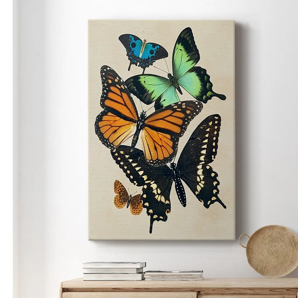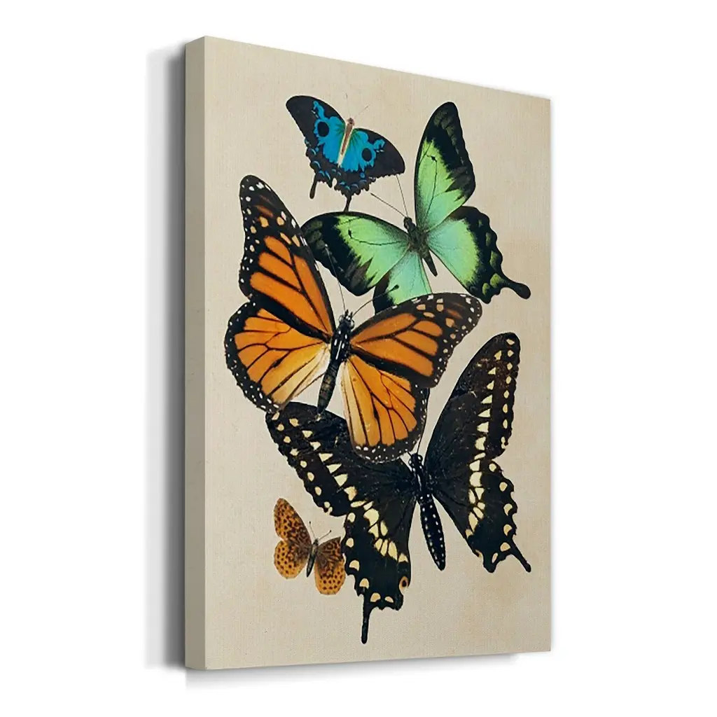 Collaged Butterflies I Premium Gallery Wrapped Canvas - Ready to Hang A premium hand stretched gallery wrapped canvas print created to last. Featuring a beveled a solid wood stretcher bar, each piece comes ready to hand 6 SIZES AVAILABLE 8''X12'' - Overall Size 12''X18'' - Overall Size 18''X27'' - Overall Size 24''x36'' - Overall Size 32''x48'' - Overall Size 40''x60'' - Overall Size Each piece is made to order. Built to Last Each piece comes ready to hang Solid wood stretcher Fade and Water resistant Made domestically