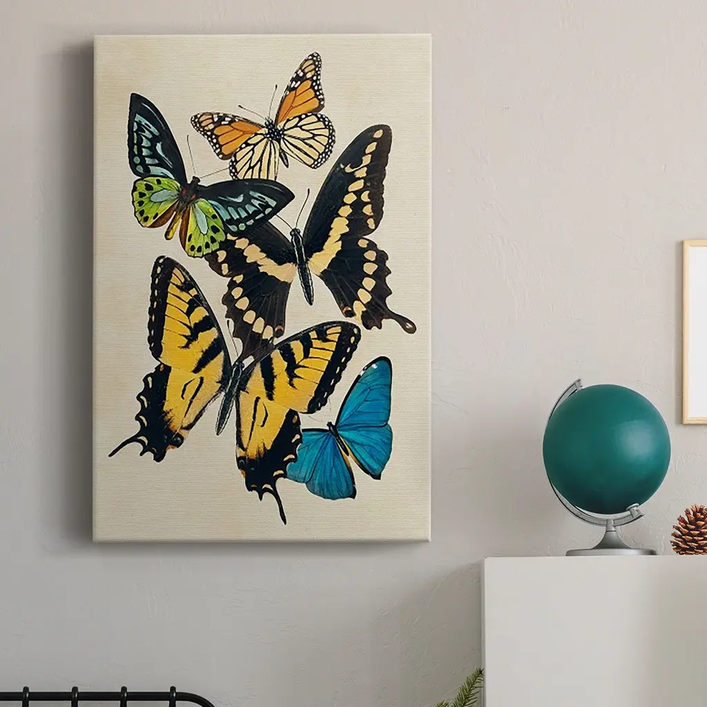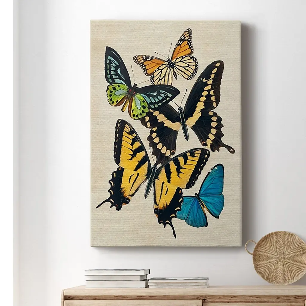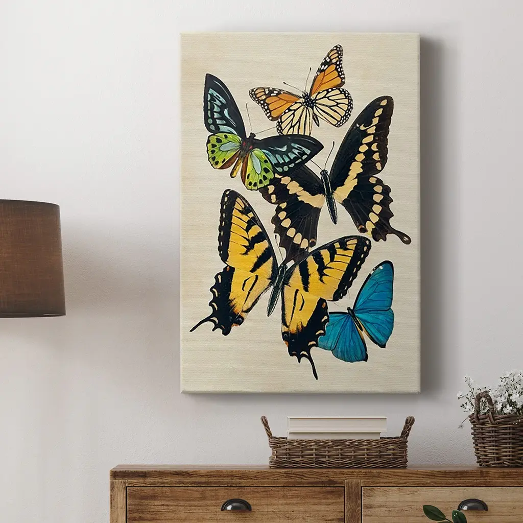 Collaged Butterflies II Premium Gallery Wrapped Canvas - Ready to Hang A premium hand stretched gallery wrapped canvas print created to last. Featuring a beveled a solid wood stretcher bar, each piece comes ready to hand 6 SIZES AVAILABLE 8''X12'' - Overall Size 12''X18'' - Overall Size 18''X27'' - Overall Size 24''x36'' - Overall Size 32''x48'' - Overall Size 40''x60'' - Overall Size Each piece is made to order. Built to Last Each piece comes ready to hang Solid wood stretcher Fade and Water resistant Made domestically