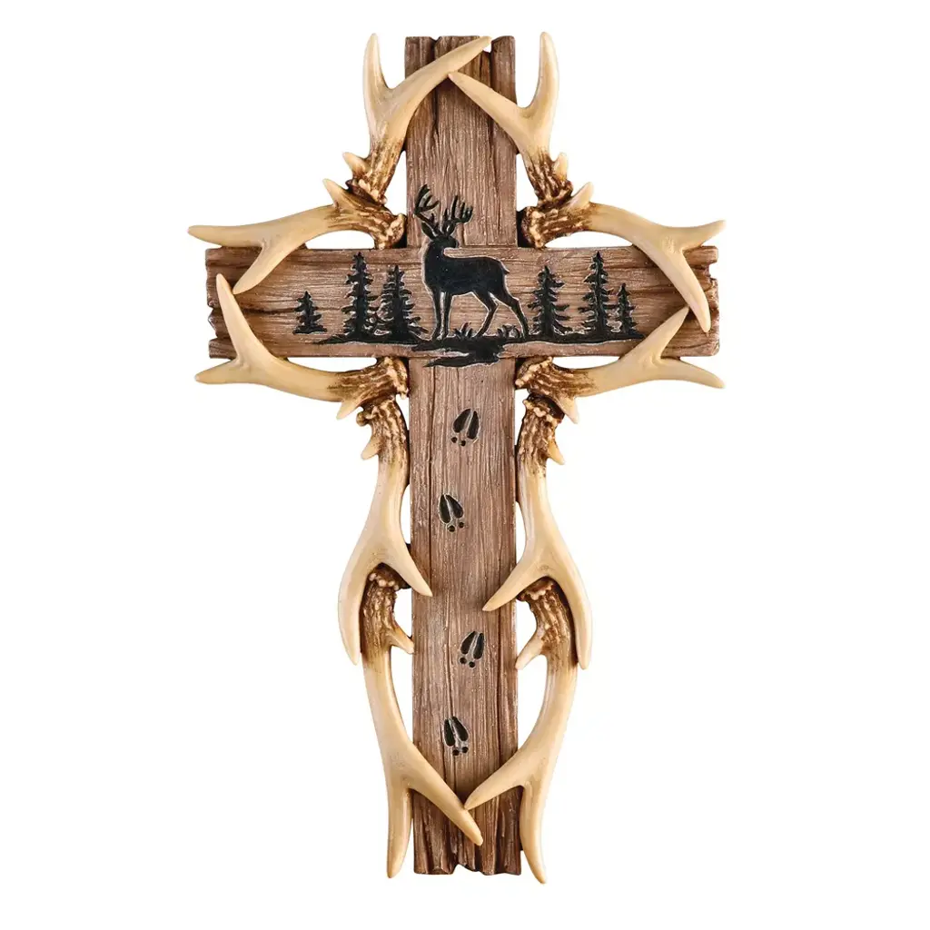 Collections Etc Realistic Deer Antlers and Rustic Wood-Look Wall Art Cross 7.75" x 0.88" x 12.25"