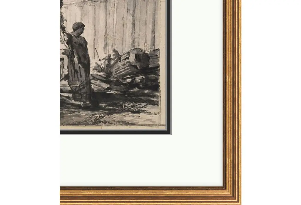 Designed by us and available only at One Kings Lane: An etching of Roman architecture is beautifully reproduced here and printed on archival matte paper. Matted and displayed under glass in an antiqued frame, this piece arrives ready to hang.