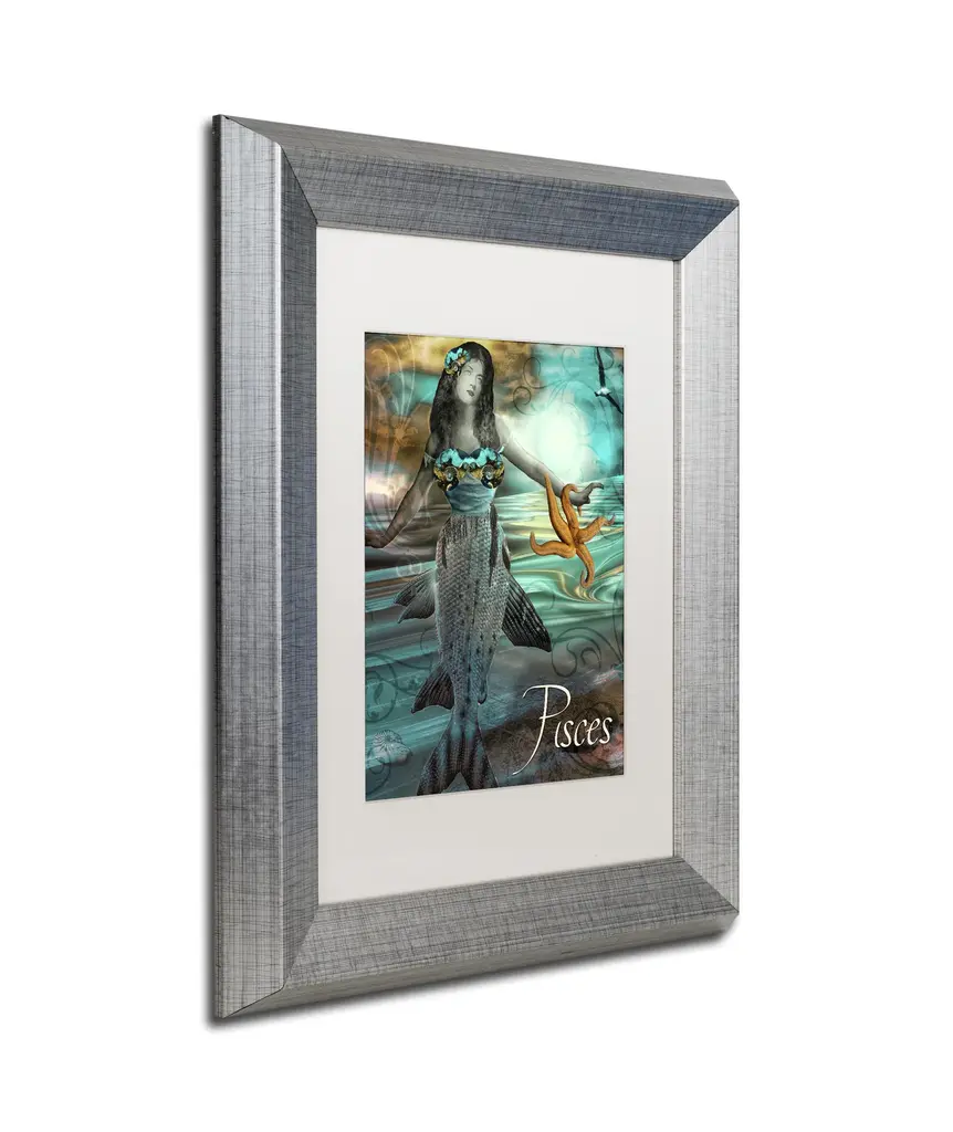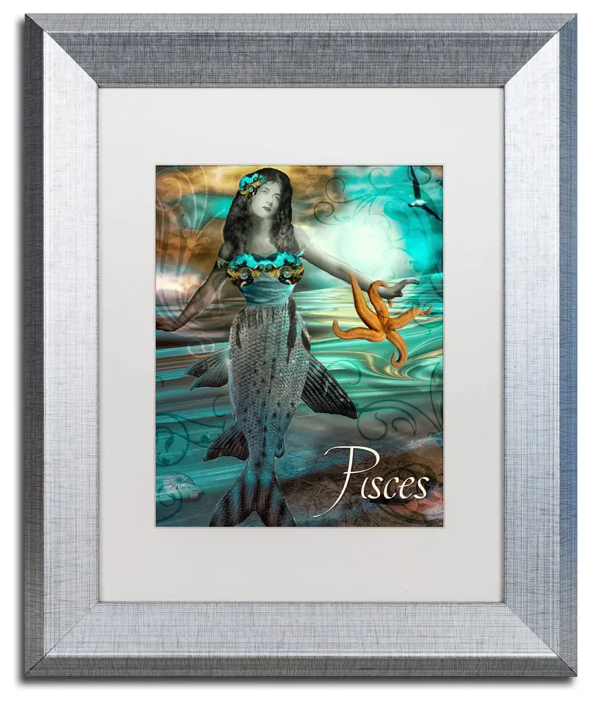 Artist: Color BakerySubject: AstrologyStyle: ContemporaryProduct Type: Silver Frame, White Mat, AcrylicMade in USAThis ready to hang, matted framed art piece features a mermaid with a starfish and the word "Pisces" written beside her.Whether it's trend-right dinnerware collections, fabric, hostess-ware, and home decor accents, gift items, wall decor or paper goods, Color Bakery is unusually diversified when it comes to designing in widely varying styles and art genres. From repeat patterns to botanicals to coastal and kitchen (food) art, Color Bakery is synonymous with diversity.An 8x10 giclee print under acrylic in an 11x14 silver frame. Giclee (jee-clay) is an advanced printmaking process for creating museum quality fine art reproductions. This high quality print is matted using antique white matting and comes in a silver frame. A clear acrylic facing is added to protect the print. The piece is fully assembled by professional framers and comes ready to hang. The antique white mat allows the image to really stand out, making it a great addition to any space.
