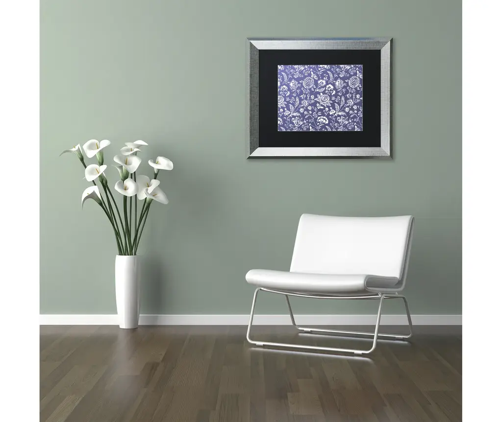Artist: Color BakerySubject: FloralStyle: ContemporaryProduct Type: Silver Frame, Black Mat, AcrylicMade in USAThis ready to hang, matted framed art piece features a white floral toile pattern on a blue background.Whether it's trend-right dinnerware collections, fabric, hostess-ware, and home decor accents, gift items, wall decor or paper goods, Color Bakery is unusually diversified when it comes to designing in widely varying styles and art genres. From repeat patterns to botanicals to coastal and kitchen (food) art, Color Bakery is synonymous with diversity.An 8x10 giclee print under acrylic in an 11x14 silver frame. Giclee (jee-clay) is an advanced printmaking process for creating museum quality fine art reproductions. This high quality print is matted using black matting and comes in a silver frame. A clear acrylic facing is added to protect the print. The piece is fully assembled by professional framers and comes ready to hang. The black mat allows the image to really stand out, making it a great addition to any space.