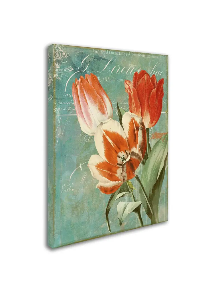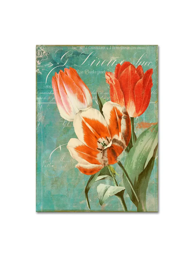 Artist: Color BakerySubject: FloralStyle: ContemporaryProduct Type: Gallery-Wrapped Canvas ArtMade in USAThis ready to hang, gallery-wrapped art piece features red and white tulips against a teal background with French writing.Whether it's trend-right dinnerware collections, fabric, "hostess-ware" and home decor accents, gift items, wall decor or paper goods, Color Bakery is unusually diversified when it comes to designing in widely varying styles and art genres. From repeat patterns to botanicals to coastal and kitchen (food) art, Color Bakery is synonymous with diversity.Giclee (jee-clay) is an advanced printmaking process for creating high quality fine art reproductions. The attainable excellence that Giclee printmaking affords makes the reproduction virtually indistinguishable from the original piece. The result is wide acceptance of Giclee by galleries, museums, and private collectors. Gallery wrap is a method of stretching an artist's canvas so that the canvas wraps around the sides and is secured a hidden, wooden frame. This method of stretching and preparing a canvas allows for a frameless presentation of the finished painting.Materials: Canvas: 100% Cotton, Stretcher Bars: Poplar