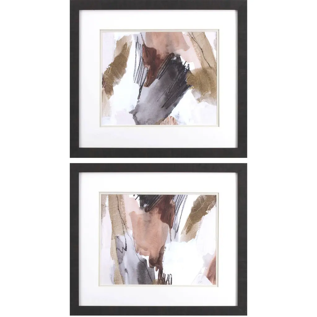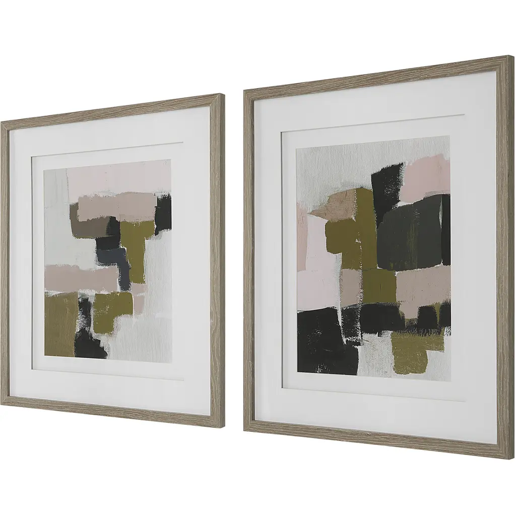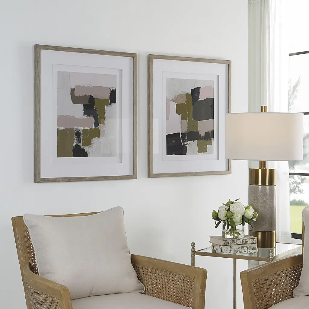This Set Of Framed Prints Showcases Abstract Compositions In Cool Olive, Mauve, Rose, And Gray Tones. Each Piece Of Art Is Placed Under Glass And Surrounded By Double White Matting And A Solid Wood Frame In A Light Oak Finish. Artwork By Jennifer Goldberger.