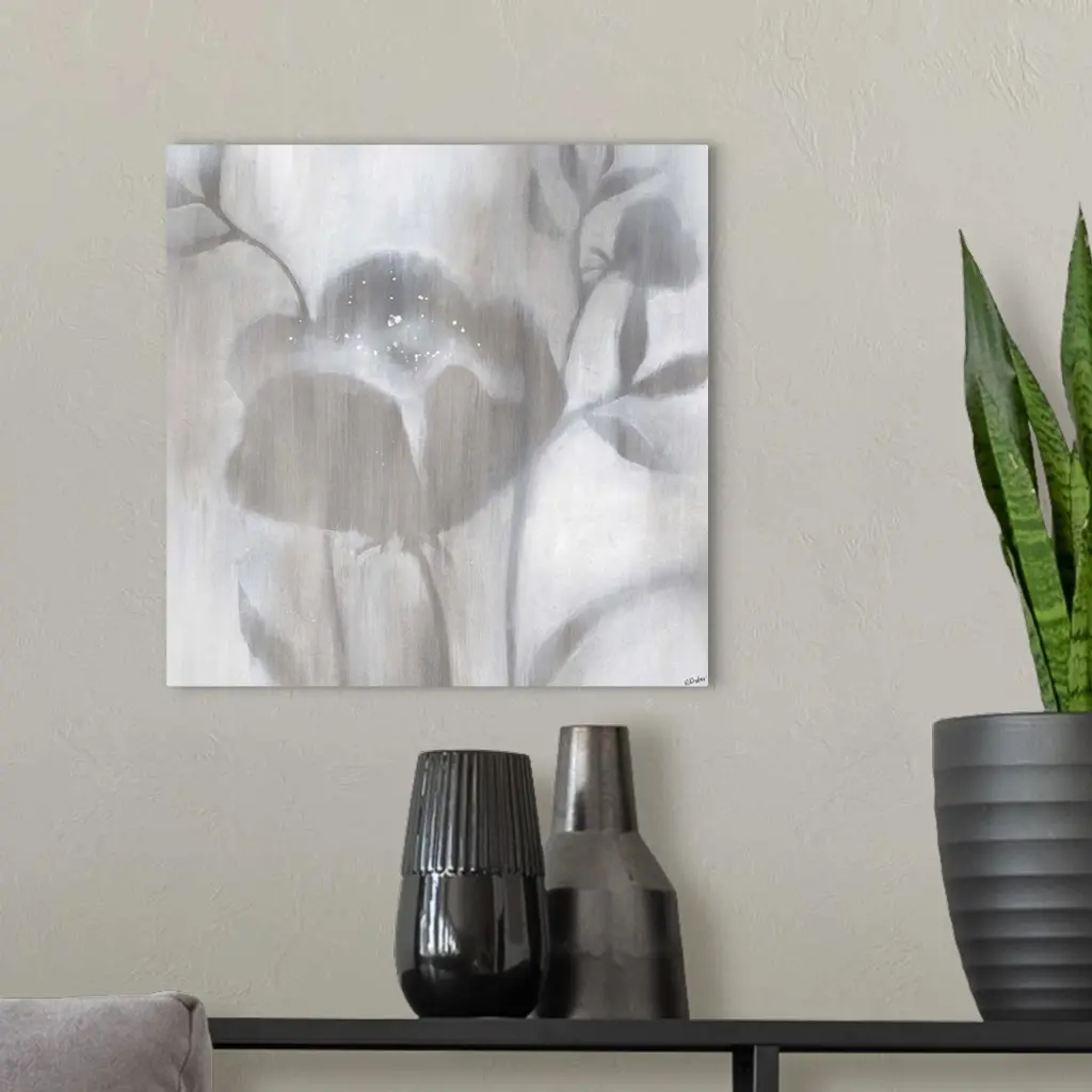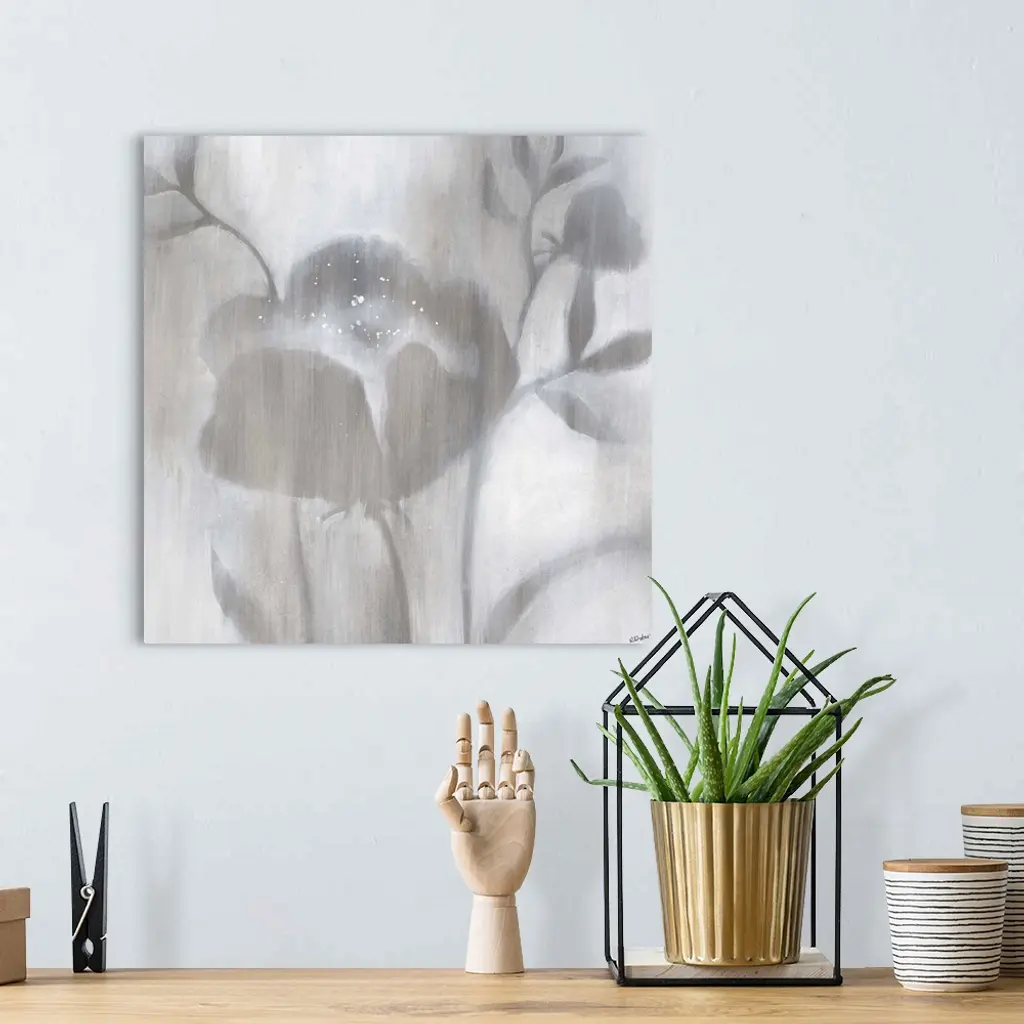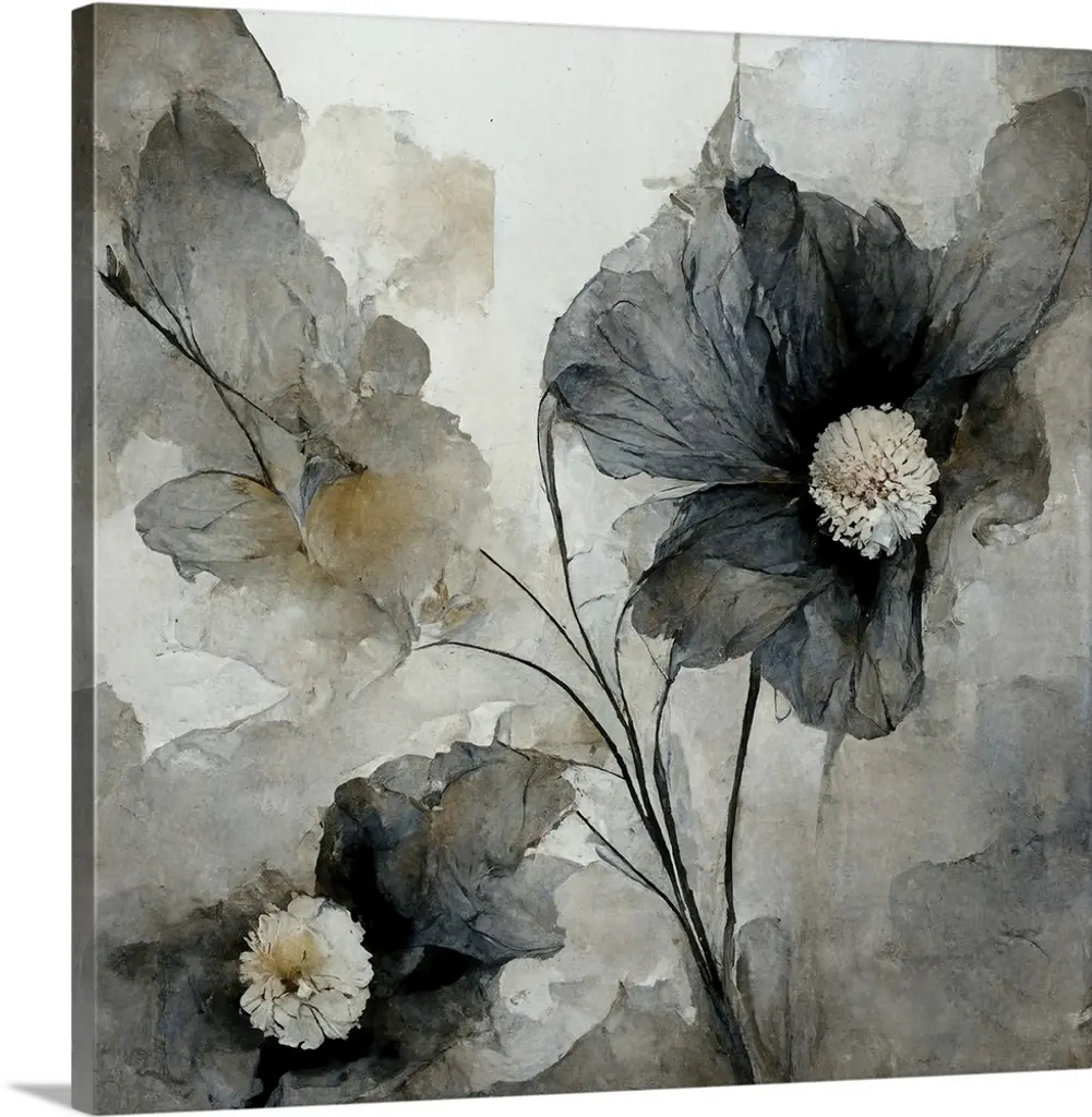 Contemporary painting of neutral flowers and stems with softened edges that seem to fade into a lighter background.