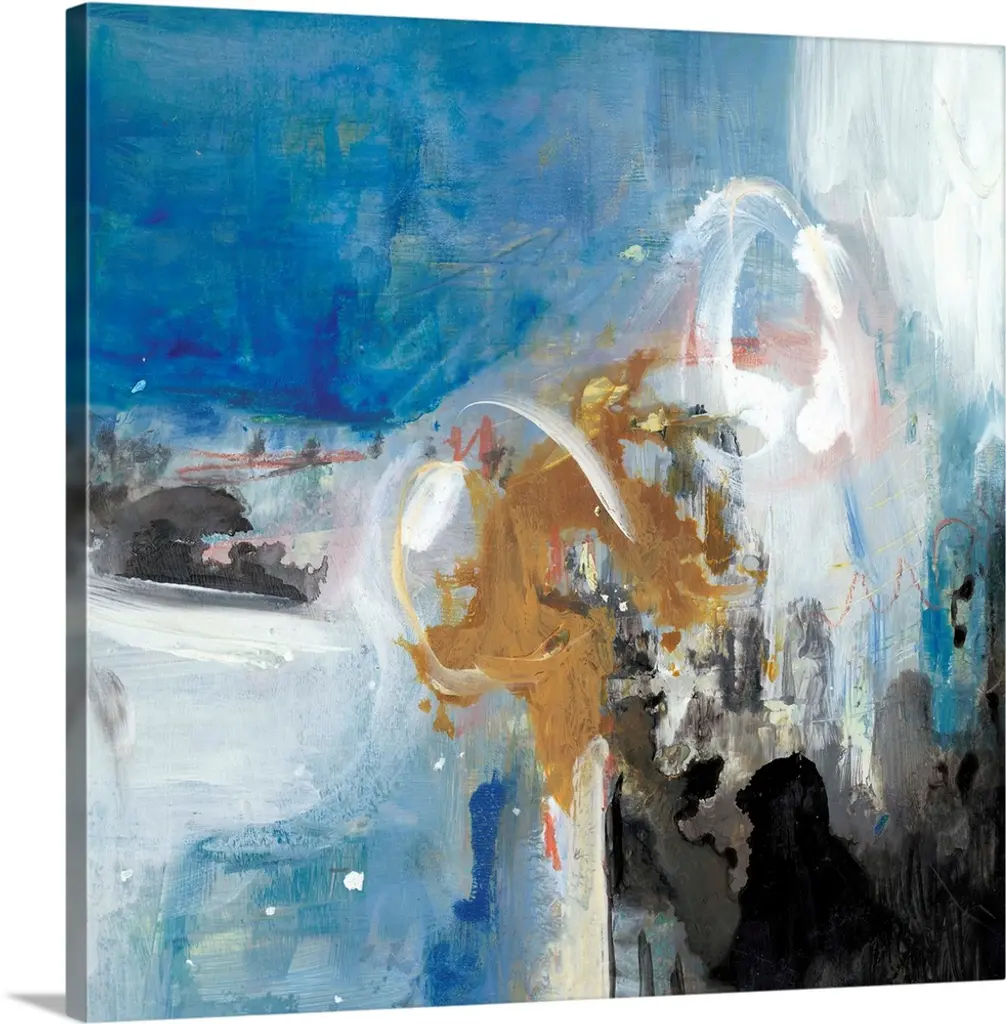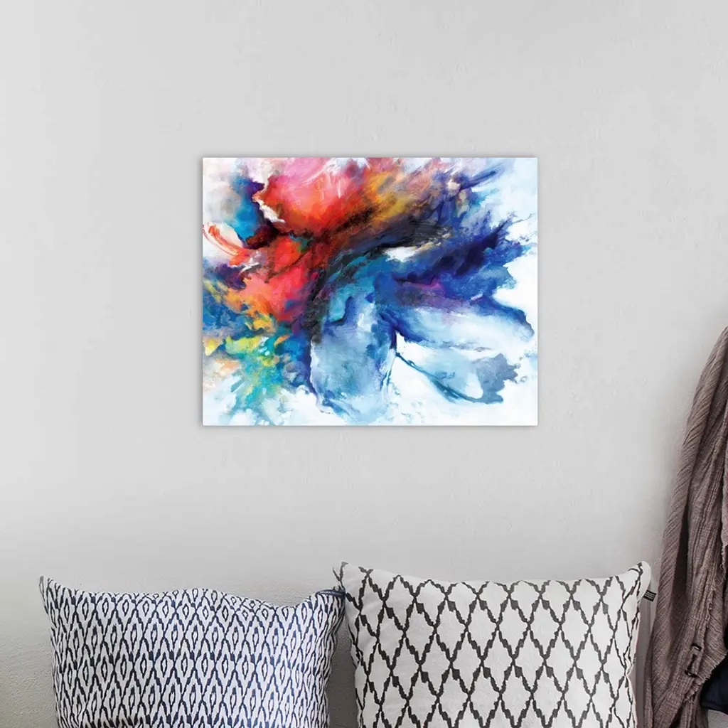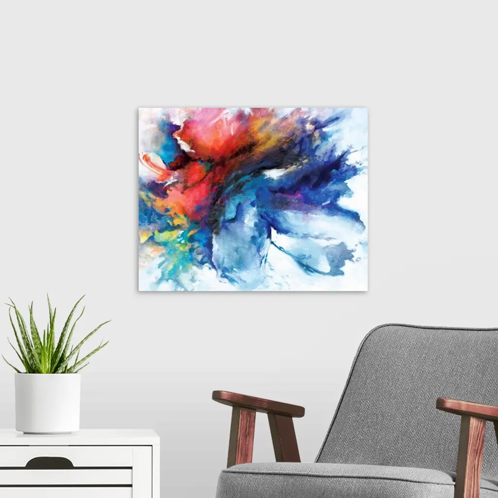A contemporary abstract painting of a cloud-like formation of deep colors and brush strokes.