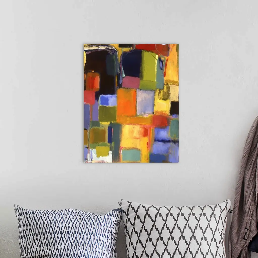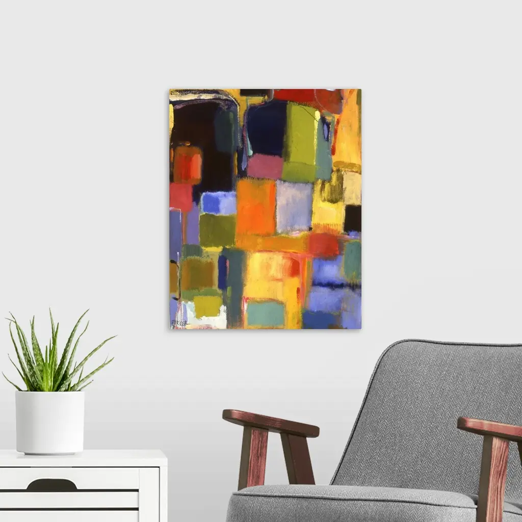 Abstract painting of soft, rounded rectangular shapes in primary colors.
