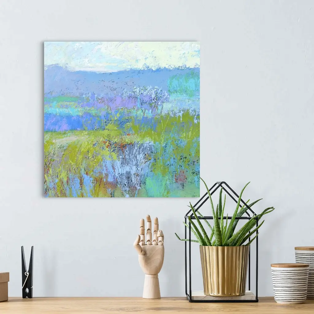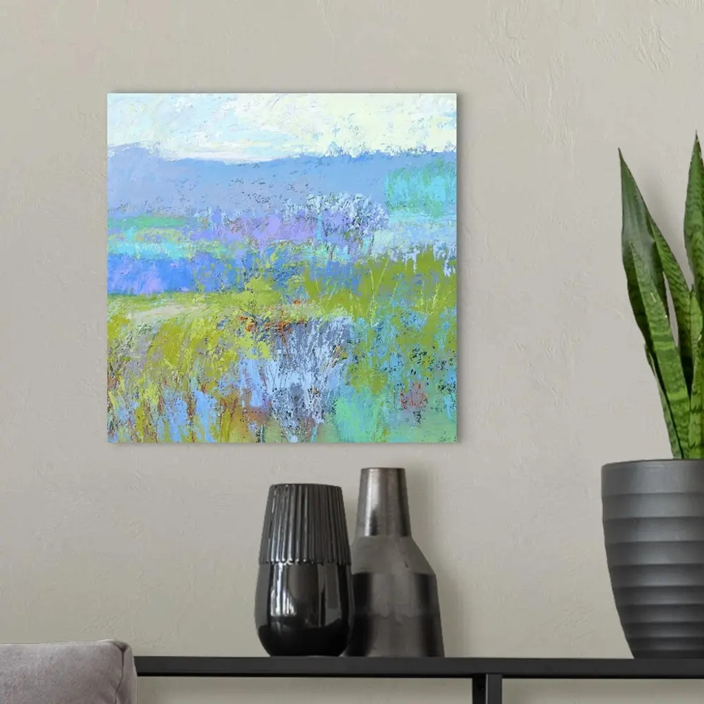 Contemporary landscape painting in vibrant blue, green, and turquoise shades.