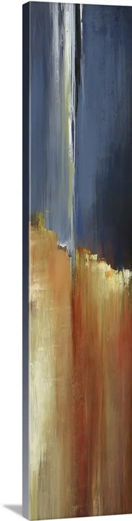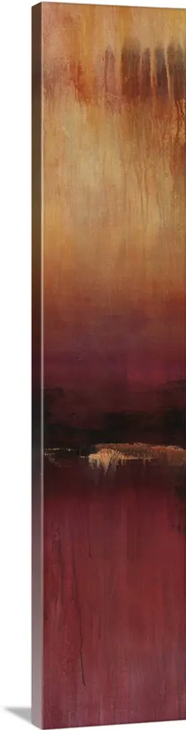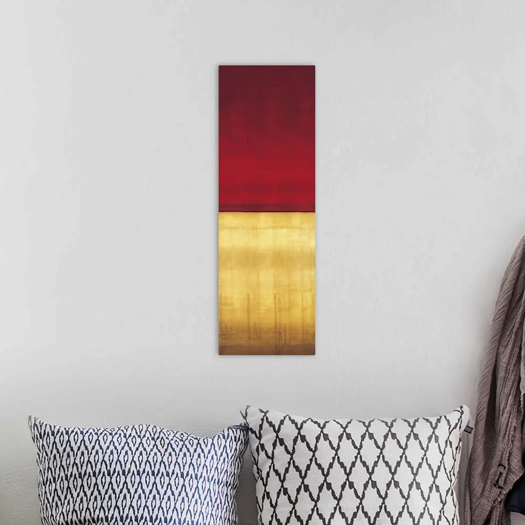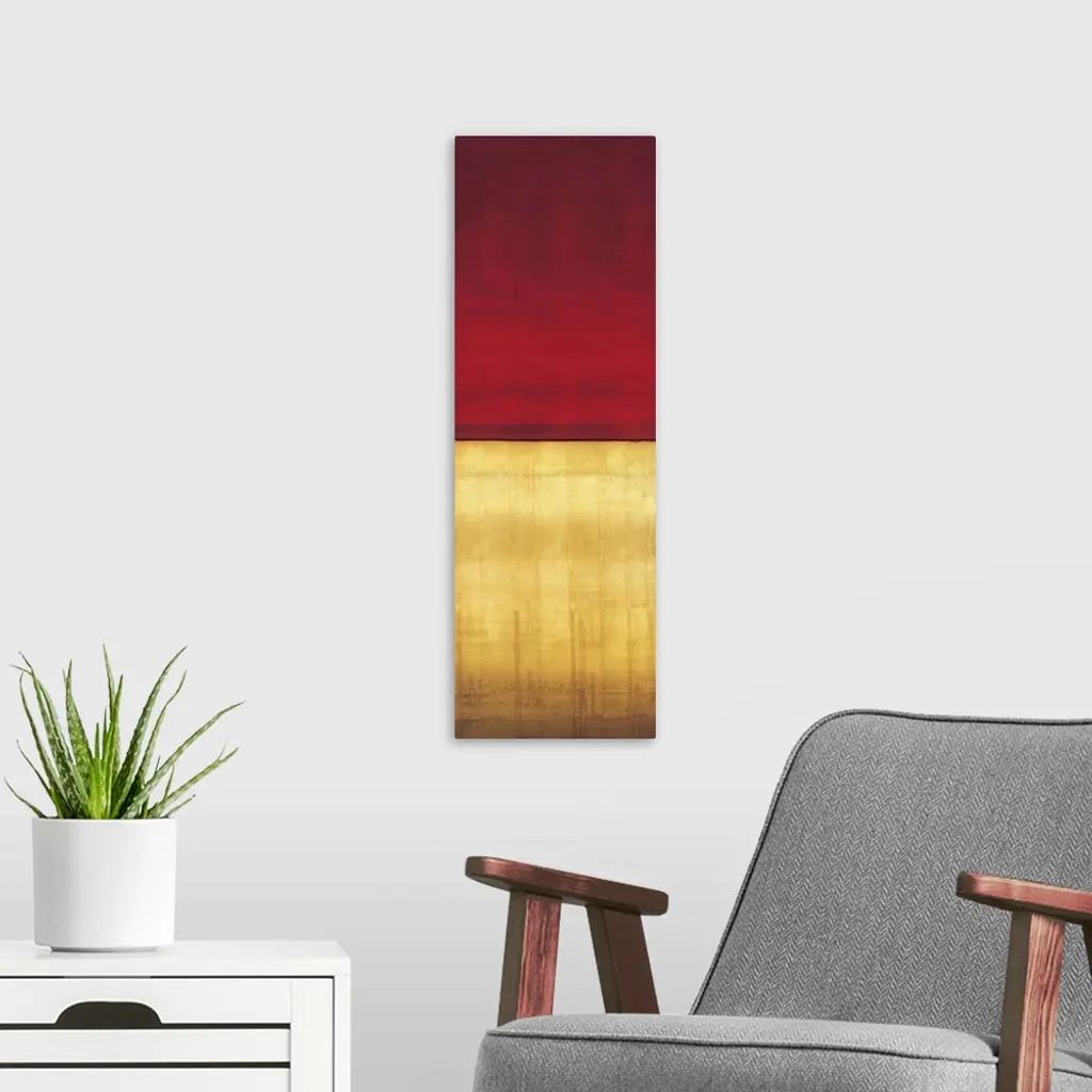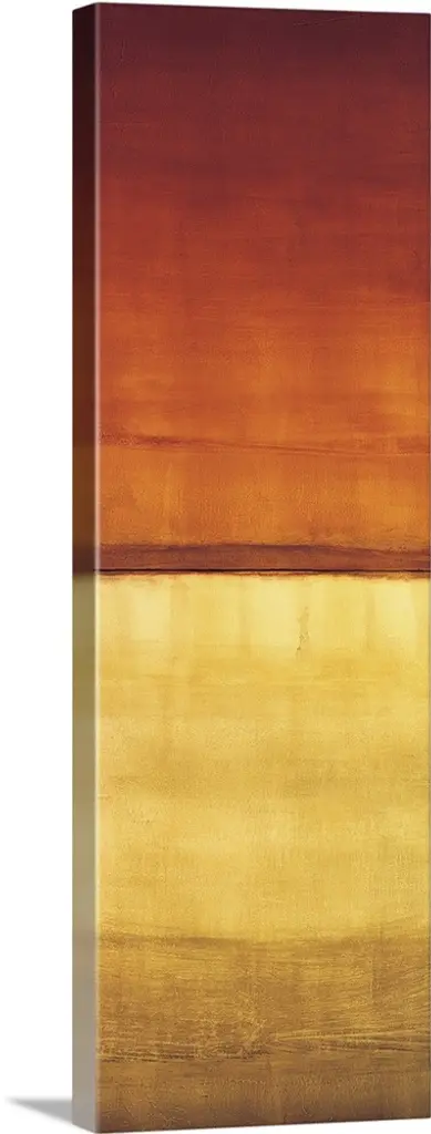 Contemporary color field painting using golden yellow tones meeting a dark red tone in the center of the image.