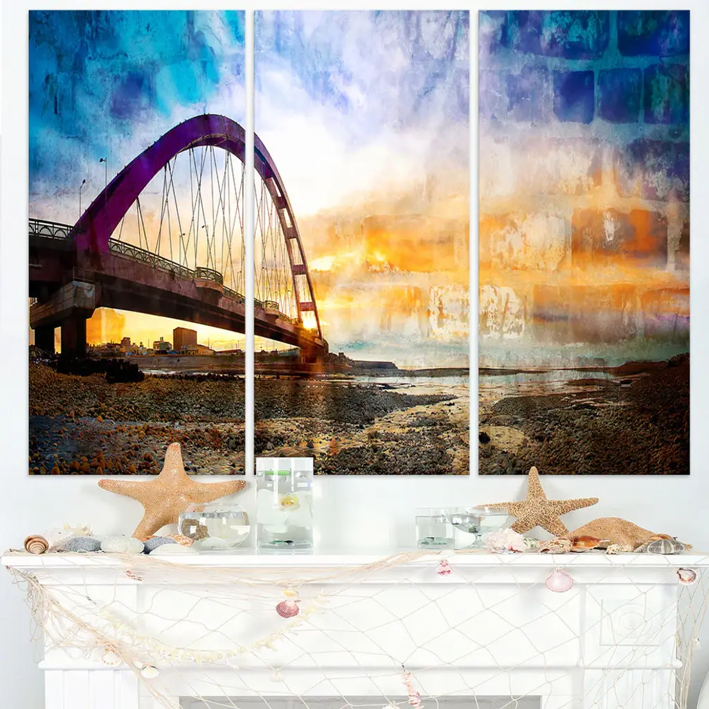 "Color Red Bridge Sunset Taiwan" Metal Wall Art, 3 Panels, 36"x28"